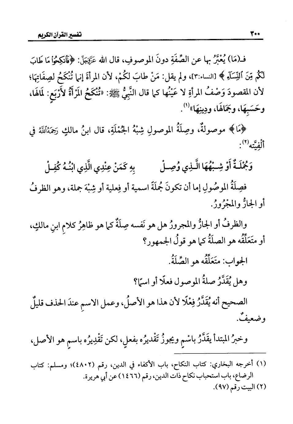 فـ (مَا) يُعْبَّرُ بها عن الصِّفَةِ دونَ الموصوفِ، قال اللَّه عَزَّ وَجَلَّ: {فَانْكِحُوا مَا طَابَ لَكُمْ مِنَ النِّسَاءِ} [النساء: ٣]، ولم يقل: مَنْ طابَ لكُمْ؛ لأن المرأةَ إنما تُنْكَحُ لصِفَاتِهَا؛ لأن المقصودَ وَصْفُ المرأةِ لا عَيْنُها كما قال النَّبِيُّ -صلى اللَّه عليه وسلم-: "تُنْكَحُ المَرْأَةُ لأَرْبَعٍ: لمَالهَا، وحَسَبِهَا، وجَمَالهَا، ودِينِهَا" (¬١).