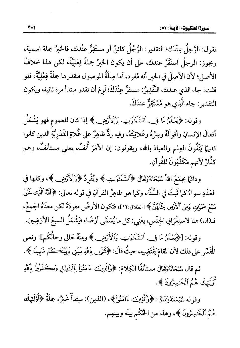 ودائمًا يجمَعُ اللَّهُ سُبْحَانَهُ وَتَعَالَى {السَّمَاوَاتِ} ويُفْرِدُ {وَالْأَرْضِ}، وكلها في العَدَدِ سواءُ كما ثَبتَ في السُّنَّة، وكما هو ظاهِرُ القرآنِ في قوله تعالى: {اللَّهُ الَّذِي خَلَقَ سَبْعَ سَمَاوَاتٍ وَمِنَ الْأَرْضِ مِثْلَهُنَّ} [الطلاق: ١٢]، فتكون الأرضُ مفردَةً لكن معنَاهُ الجمعُ، فـ (ال) هنا لاستِغْرَاقِ الجِنْسِ، يعْنِي: كل ما يُسَمَّى أرْضًا، فيَشْمَلُ السبعَ الأرَضِين.