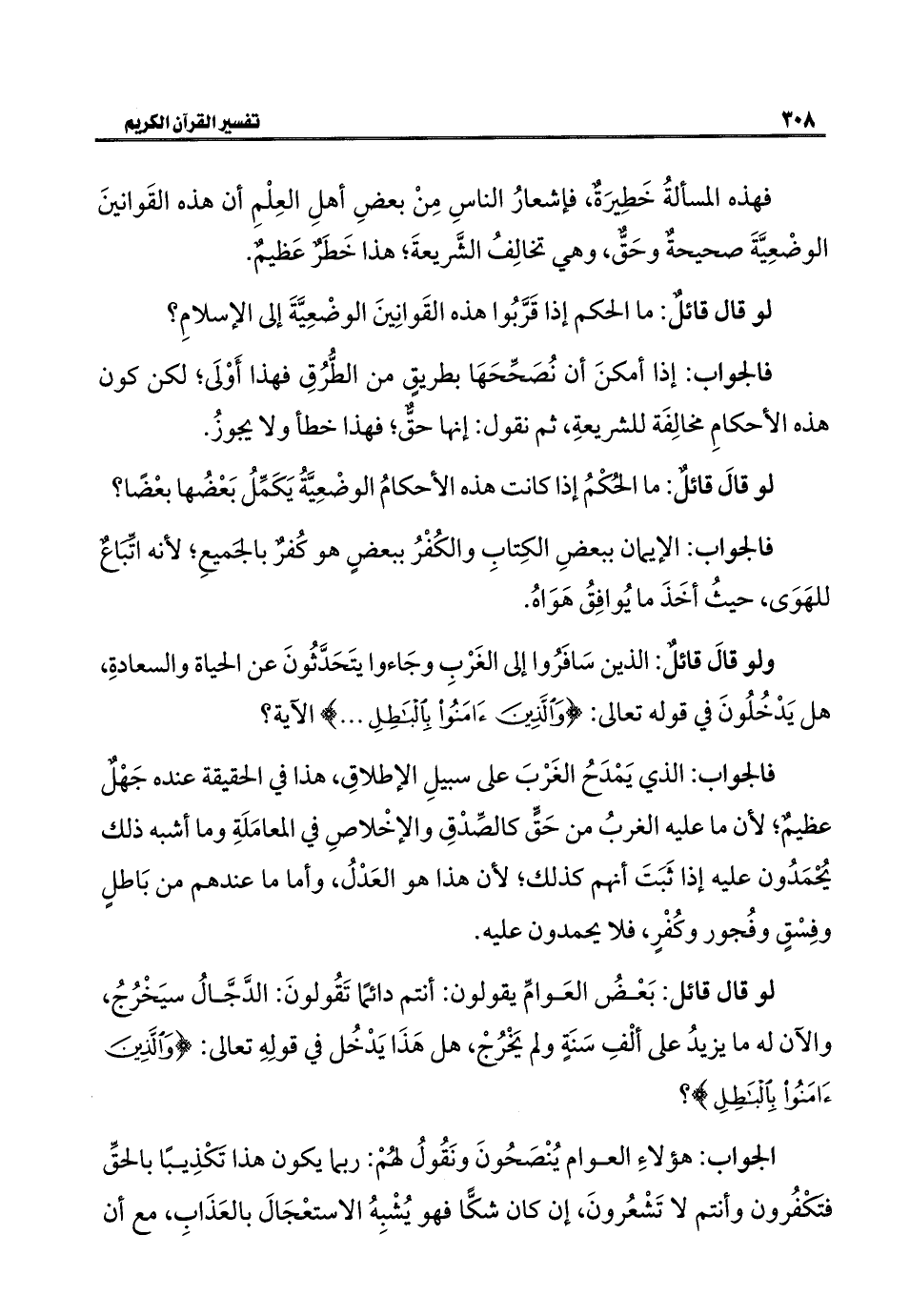 فهذه المسألةُ خَطِيرَةٌ، فإشعارُ الناسِ مِنْ بعضِ أهلِ العِلْمِ أن هذه القَوانينَ الوضْعِيَّةَ صحيحةٌ وحَقٌّ، وهي تخالِفُ الشَّريعةَ؛ هذا خَطَرٌ عَظيمٌ.