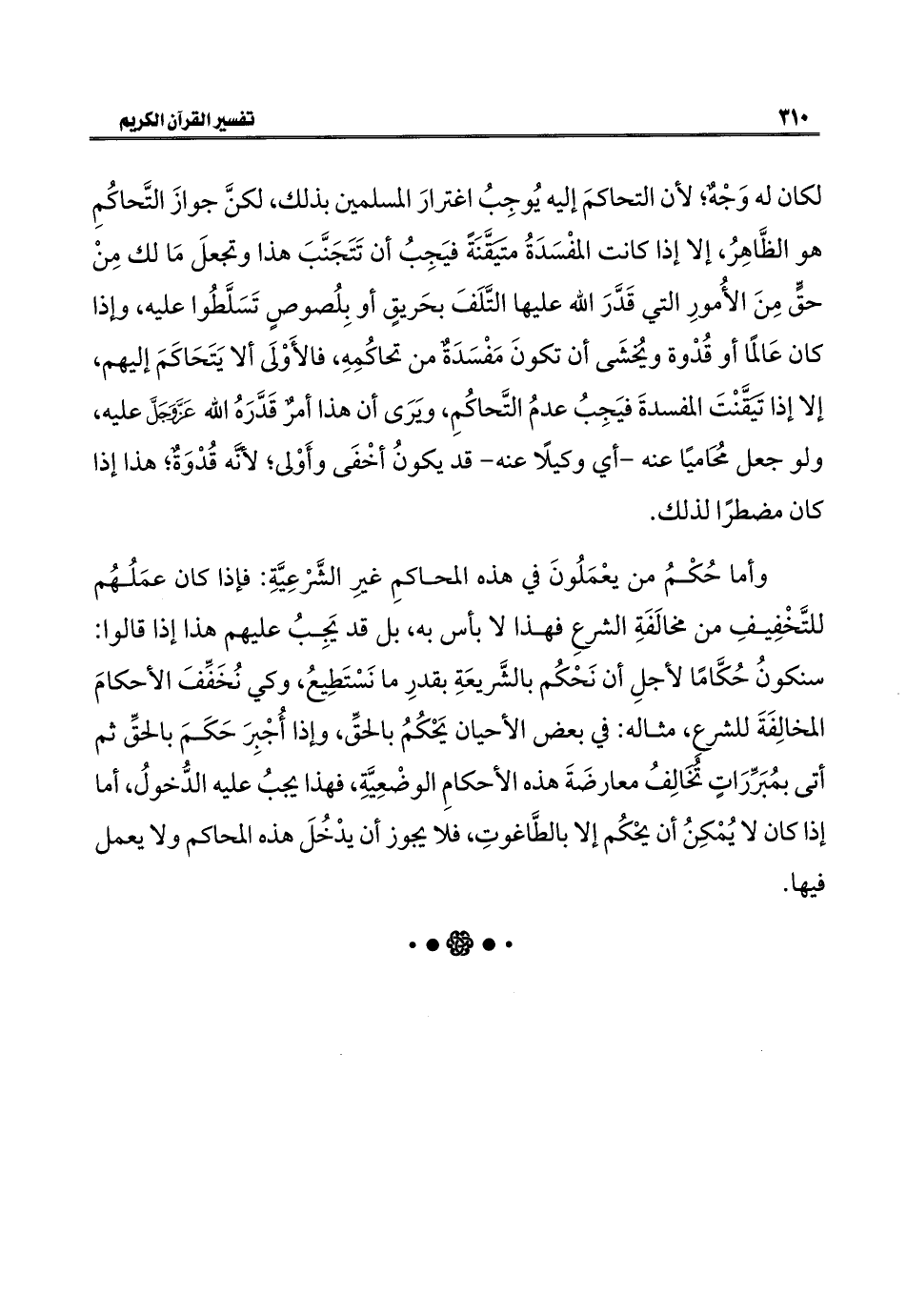 لكان له وَجْهٌ؛ لأن التحاكمَ إليه يُوجِبُ اغترارَ المسلمين بذلك، لكنَّ جوازَ التَّحاكُمِ هو الظَّاهِرُ، إلا إذا كانت المفْسَدَةُ متَيَقَّنَةً فيَجِبُ أن تَتَجَنَّبَ هذا وتجعلَ مَا لك مِنْ حقٍّ مِنَ الأُمورِ التي قَدَّرَ اللَّه عليها التَّلَفَ بحَريقٍ أو بِلُصوصٍ تَسَلَّطُوا عليه، وإذا كان عَالمًا أو قُدْوة ويُخشَى أن تكونَ مَفْسَدَةٌ من تحاكُمِهِ، فالأَوْلَى ألا يَتَحَاكَمَ إليهم، إلا إذا تَيَقَّنْتَ المفسدةَ فيَجِبُ عدمُ التَّحاكُمِ، ويَرَى أن هذا أمرٌ قَدَّرَهُ اللَّه عَزَّ وَجَلَّ عليه، ولو جعل مُحَاميًا عنه -أي وكيلًا عنه- قد يكونُ أخْفَى وأَوْلى؛ لأنَّه قُدْوَةٌ؛ هذا إذا كان مضطرًا لذلك.