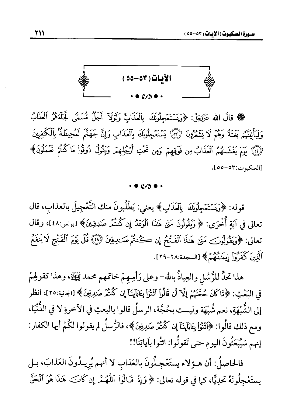 * قالَ اللَّه عَزَّ وَجَلَّ: {وَيَسْتَعْجِلُونَكَ بِالْعَذَابِ وَلَوْلَا أَجَلٌ مُسَمًّى لَجَاءَهُمُ الْعَذَابُ وَلَيَأْتِيَنَّهُمْ بَغْتَةً وَهُمْ لَا يَشْعُرُونَ (٥٣) يَسْتَعْجِلُونَكَ بِالْعَذَابِ وَإِنَّ جَهَنَّمَ لَمُحِيطَةٌ بِالْكَافِرِينَ (٥٤) يَوْمَ يَغْشَاهُمُ الْعَذَابُ مِنْ فَوْقِهِمْ وَمِنْ تَحْتِ أَرْجُلِهِمْ وَيَقُولُ ذُوقُوا مَا كُنْتُمْ تَعْمَلُونَ} [العنكبوت: ٥٣ - ٥٥].