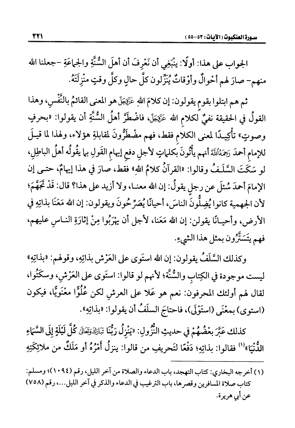وكذلك السَّلَفُ يقولون: إن اللَّه استَوى على العَرْش بذاتِهِ، وقولهم: "بذاتِهِ" ليست موجودة في الكِتابِ والسُّنَّة؛ لأنهم لو قالوا: استَوى على العَرْشِ، وسكَتُوا، لقال لهم أولئك المحرفون: نعم هو عَلا على العرشِ لكن عُلُوًّا معْنَويًّا، فيكون (استوى) بمعْنَى (استَوْلَى)، فاحتاجَ السلَفُ أن يقولوا: "بذاتِهِ".