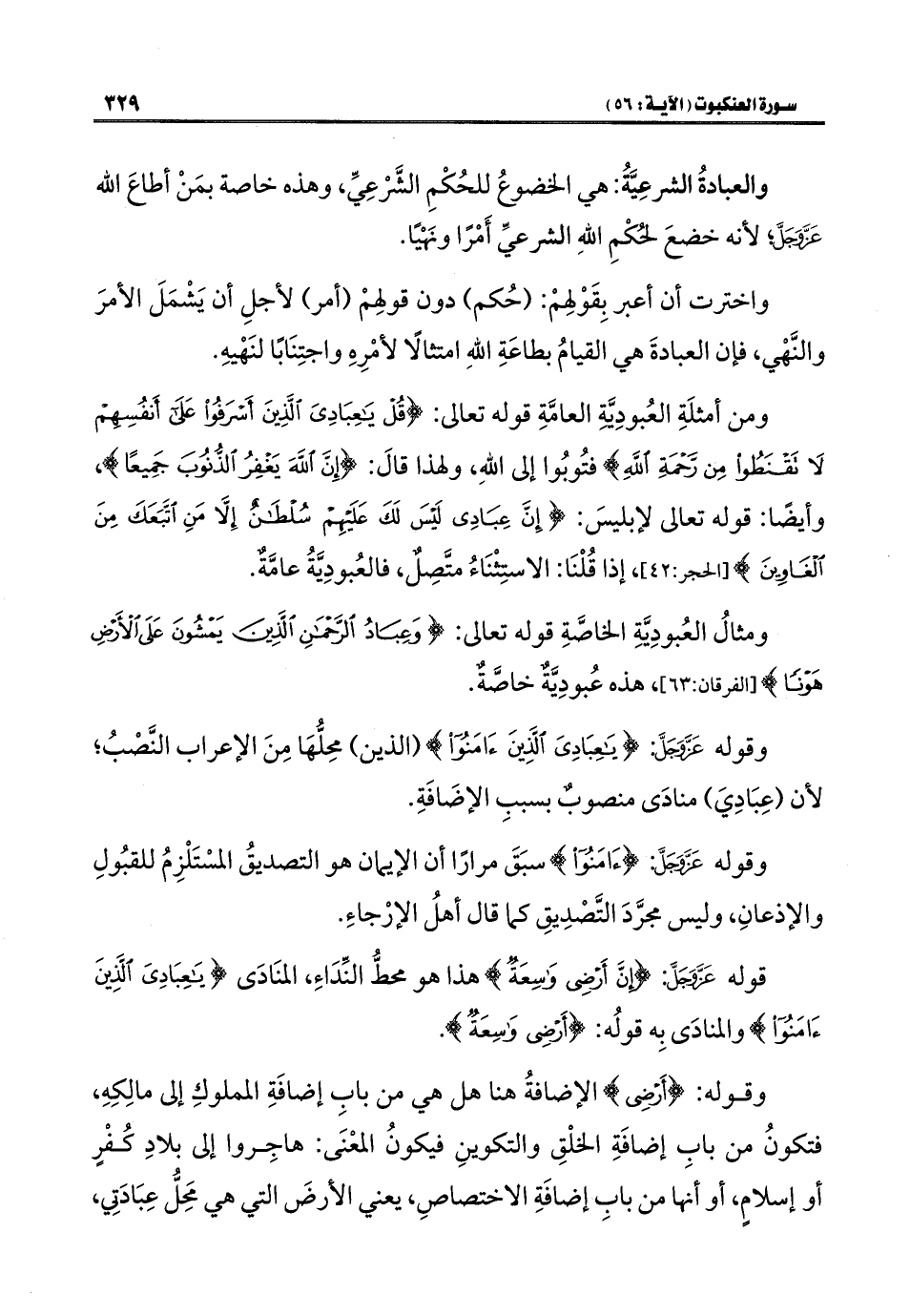 ومن أمثلَةِ العُبودِيَّةِ العامَّةِ قوله تعالى: {قُلْ يَاعِبَادِيَ الَّذِينَ أَسْرَفُوا عَلَى أَنْفُسِهِمْ لَا تَقْنَطُوا مِنْ رَحْمَةِ اللَّهِ} فتُوُبوا إلى اللَّهِ، ولهذا قالَ: {إِنَّ اللَّهَ يَغْفِرُ الذُّنُوبَ جَمِيعًا}، وأيضًا: قوله تعالى لإبليسَ: {إِنَّ عِبَادِي لَيْسَ لَكَ عَلَيْهِمْ سُلْطَانٌ إِلَّا مَنِ اتَّبَعَكَ مِنَ الْغَاوِينَ} [الحجر: ٤٢]، إذا قُلْنَا: الاستِثْنَاءُ متَّصِلٌ، فالعُبودِيَّةُ عامَّةٌ.