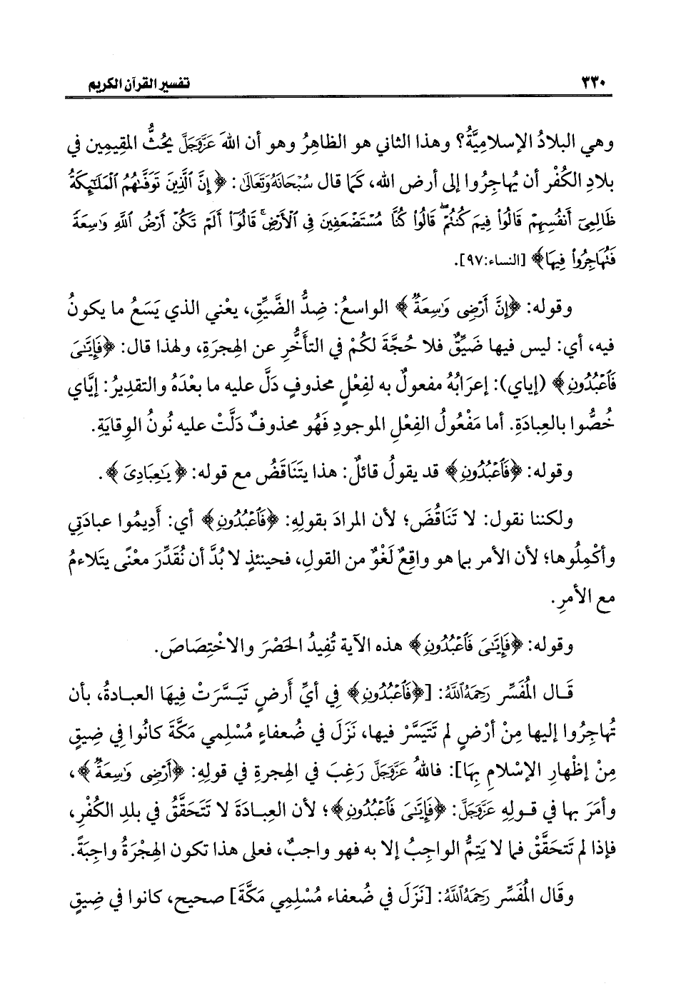 قَال المُفَسِّر رَحِمَهُ اللَّهُ: [{فَاعْبُدُونِ} فِي أيِّ أَرضٍ تَيَسَّرَتْ فِيهَا العبادةُ، بأن تُهاجِرُوا إليها مِنْ أرْضٍ لم تَتَيَسَّرْ فيها، نَزَلَ في ضُعفاءٍ مُسْلِمي مَكَّةَ كانُوا فِي ضِيقٍ مِنْ إظْهارِ الإسْلامِ بِهَا]: فاللَّهُ عَزَّ وَجَلَّ رَغِبَ في الهِجرةِ في قولِهِ: {أَرْضِي وَاسِعَةٌ}، وأمَرَ بها في قولِهِ عَزَّ وَجَلَّ: {فَإِيَّايَ فَاعْبُدُونِ}؛ لأن العِبادَةَ لا تَتَحَقَّقُ في بلدِ الكُفْرِ، فإذا لم تَتحَقَّقْ فما لا يَتِمُّ الواجِبُ إلا به فهو واجبٌ، فعلى هذا تكون الِهجْرَةُ واجِبَةً.