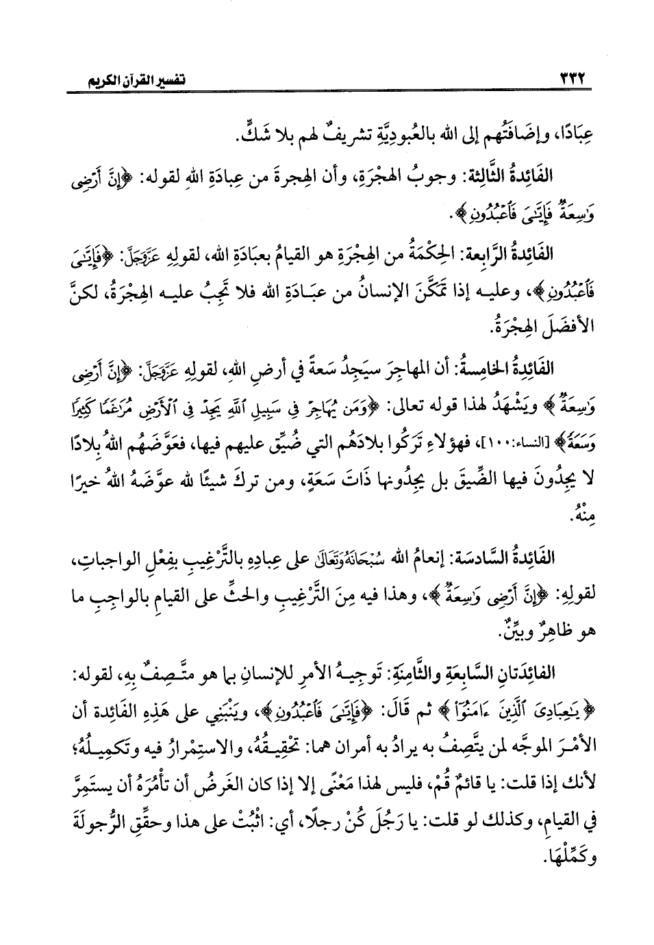 الفَائِدةُ الرَّابِعة: الحِكْمَةُ من الهِجْرَةِ هو القيامُ بعبَادَةِ اللَّه، لقولِهِ عَزَّ وَجَلَّ: {فَإِيَّايَ فَاعْبُدُونِ}، وعليه إذا تَمَكَّنَ الإنسانُ من عبَادَةِ اللَّه فلا تَجِبُ عليه الهِجْرَةُ، لكنَّ الأفضَلَ الهِجْرَةُ.