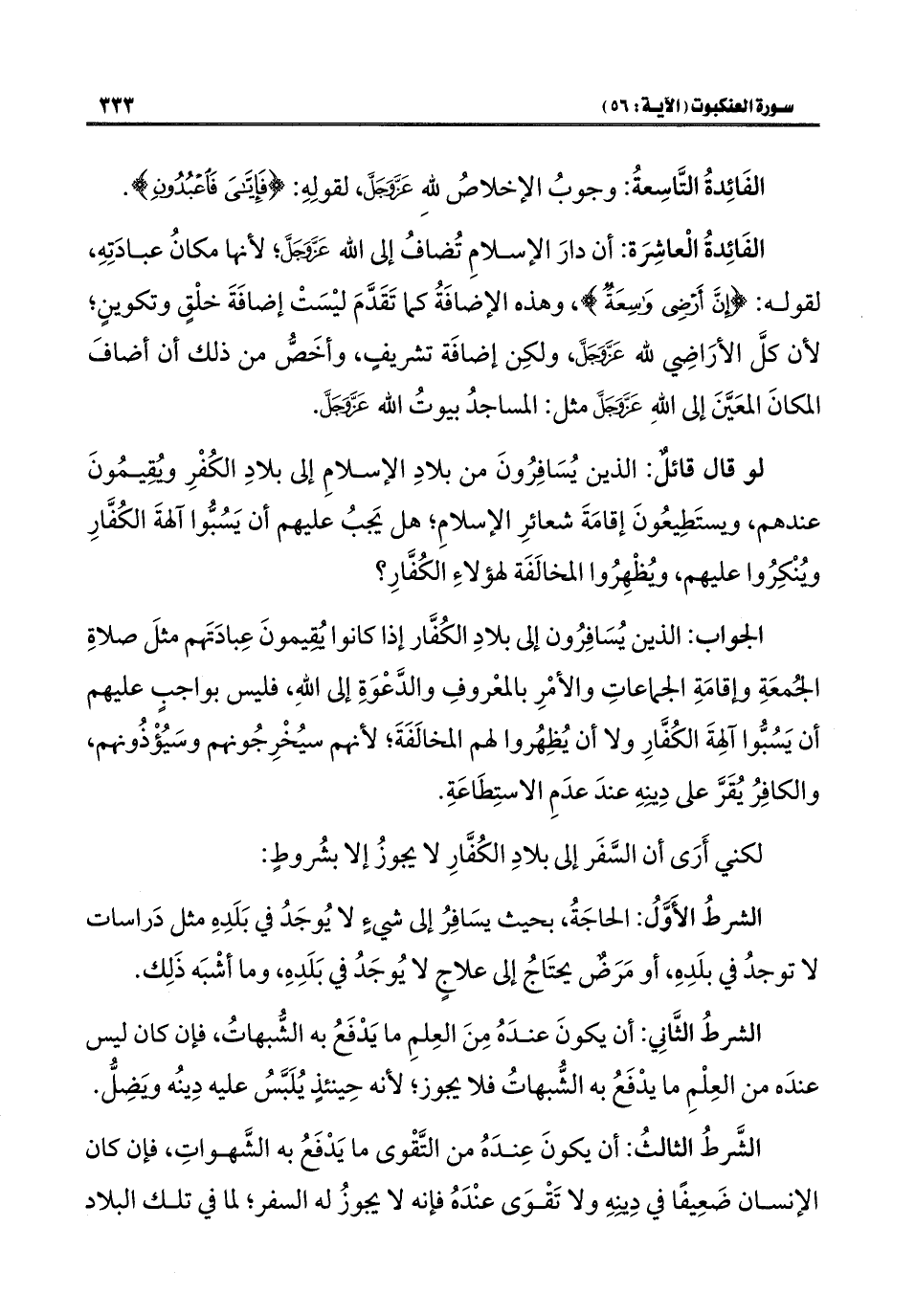 لكني أَرَى أن السَّفَر إلى بلادِ الكُفَّارِ لا يجوزُ إلا بشُروطٍ: