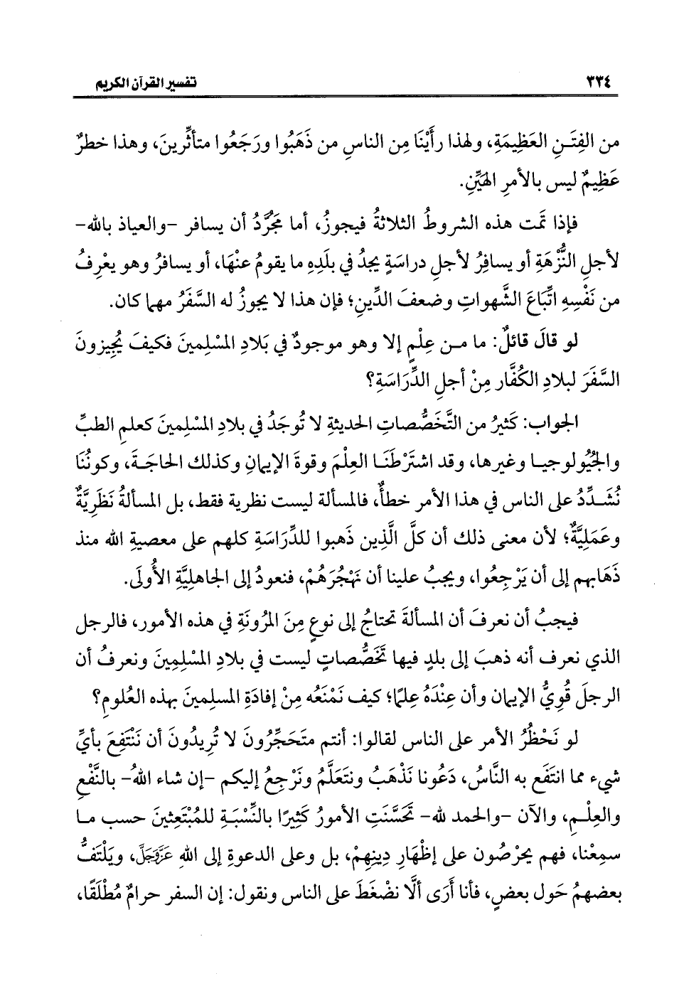 لو نَحْظُرُ الأمر على الناس لقالوا: أنتم متَحَجِّرُونَ لا تُرِيدُونَ أن نَنْتَفِعَ بأيِّ شيء مما انتَفَع به النَّاسُ، دَعُونا نَذْهَبُ ونتَعَلَّمُ ونَرْجِعُ إليكم -إن شاء اللَّهُ- بالنَّفْعِ والعِلْمِ، والآن -والحمد للَّه- تَحَسَّنَتِ الأمورُ كَثِيرًا بالنِّسْبَةِ للمُبْتَعِثينَ حسب ما سمِعْنا، فهم يحرْصُون على إظْهَارِ دِينِهِمْ، بل وعلى الدعوةِ إلى اللَّهِ عَزَّ وَجَلَّ، ويَلْتَفُّ بعضهمُ حَول بعضٍ، فأنا أَرَى ألَّا نضْغَطَ على الناس ونقول: إن السفر حرامٌ مُطْلَقًا،
