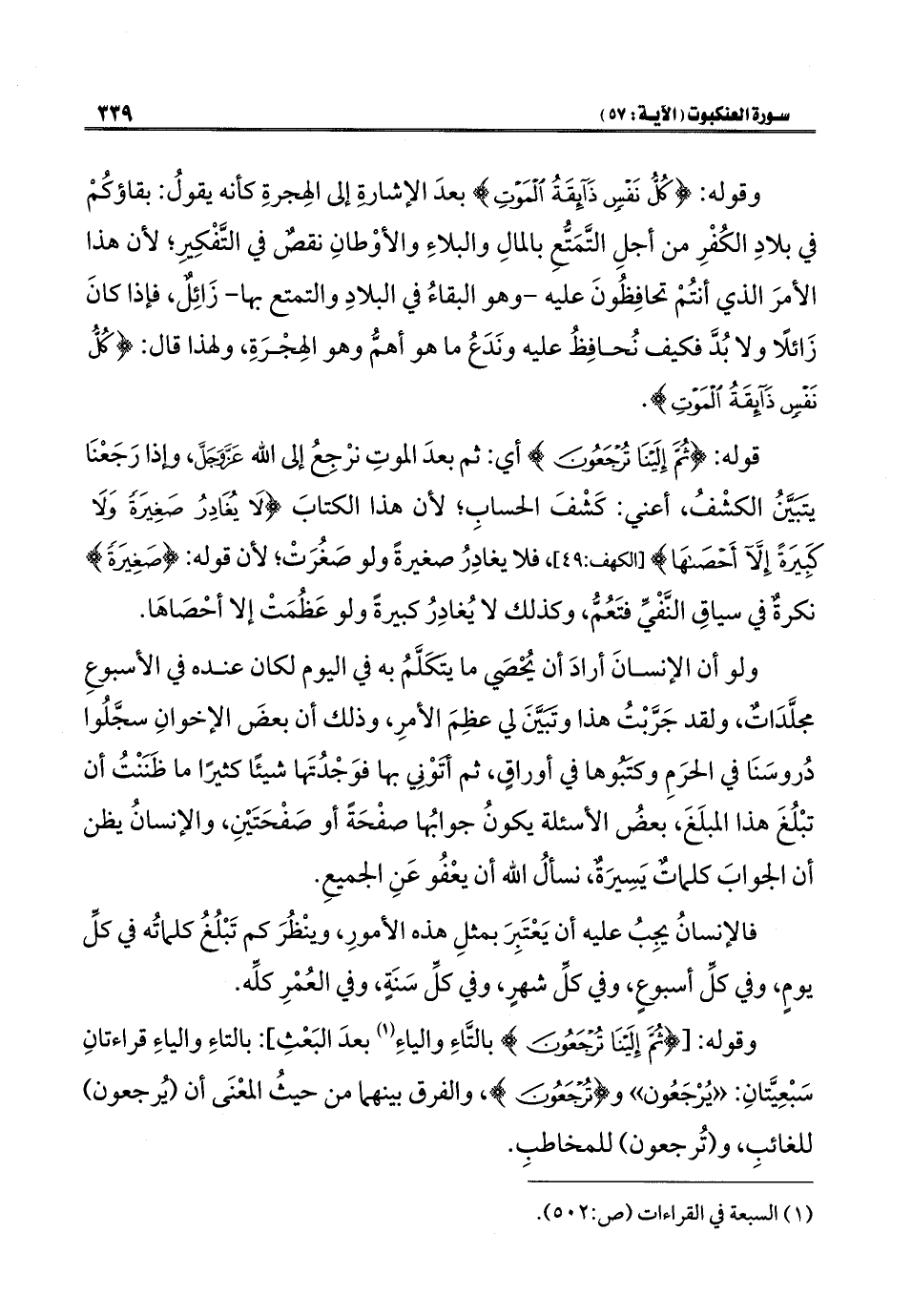 وقوله: [{ثُمَّ إِلَيْنَا تُرْجَعُونَ} بالتَّاءِ والياءِ (¬١) بعدَ البَعْثِ]: بالتاءِ والياءِ قراءتانِ سَبْعِيَّتانِ: "يُرْجَعُون" و {تُرْجَعُونَ}، والفرق بينهما من حيثُ المعْنَى أن (يُرجعون) للغائبِ، و (تُرجعون) للمخاطبِ.