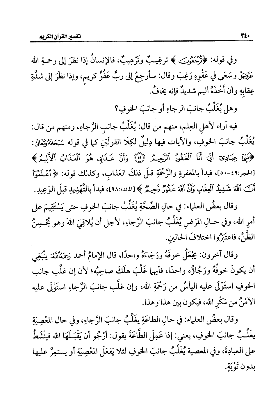فيه آراء لأهلِ العِلم، منهم من قال: يُغَلِّبُ جانبِ الرَّجاءِ، ومنهم من قال: يُغَلِّبُ جانبَ الخوفِ، والآيات فيها دِليلٌ لكِلَا القولَيْنِ كما في قوله سُبْحَانَهُ وَتَعَالَى: {نَبِّئْ عِبَادِي أَنِّي أَنَا الْغَفُورُ الرَّحِيمُ (٤٩) وَأَنَّ عَذَابِي هُوَ الْعَذَابُ الْأَلِيمُ} [الحجر: ٤٩ - ٥٠]، فبدأ بالمغفرةِ والرَّحْمَةِ قبلَ ذلكَ العَذابِ، وكذلك قوله: {اعْلَمُوا أَنَّ اللَّهَ شَدِيدُ الْعِقَابِ وَأَنَّ اللَّهَ غَفُورٌ رَحِيمٌ} [المائدة: ٩٨]، فبدأ بالتَّهْدِيدِ قبلَ الوَعِيدِ.