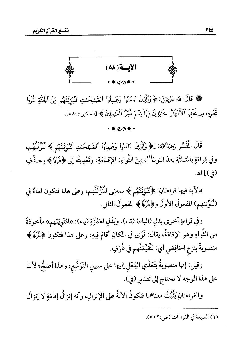 قَالَ المُفَسِّر رَحِمَهُ اللَّهُ: [{وَالَّذِينَ آمَنُوا وَعَمِلُوا الصَّالِحَاتِ لَنُبَوِّئَنَّهُمْ} نُنَزِّلَنَّهُم، وفي قِراءَةٍ بالمثلثَةِ بعدَ النون (¬١)، مِنَ الثَّواءِ: الإقامَةِ، وتَعْدِيتُه إلى {غُرَفًا} هو بحذْفِ (في)] اهـ.