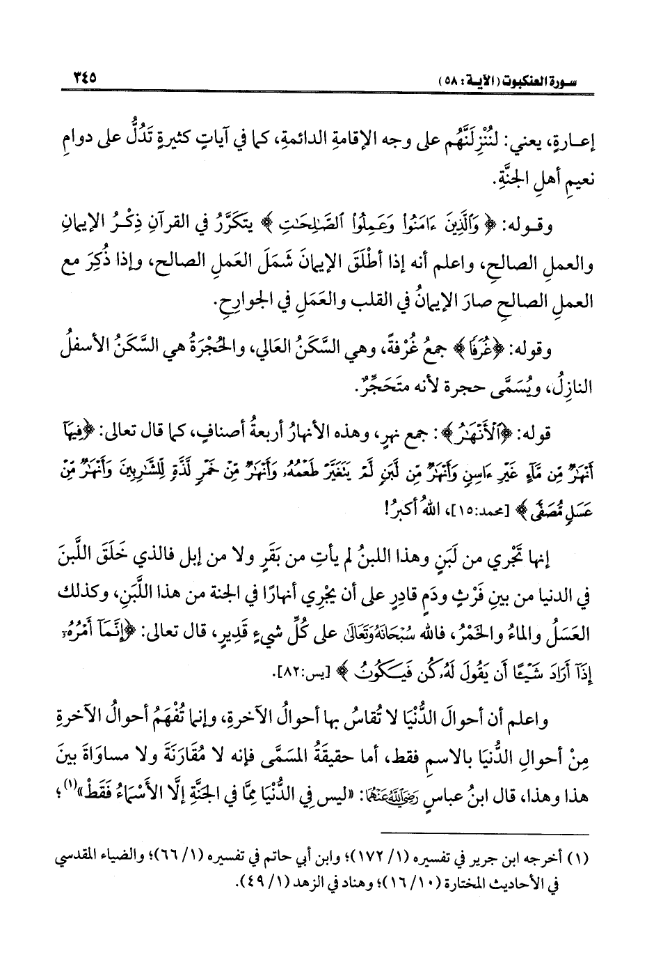 واعلم أن أحوالَ الدُّنْيَا لا تُقاسُ بها أحوالُ الآخرةِ، وإنما تُفْهَمُ أحوالُ الآخرةِ مِنْ أحوالِ الدُّنيَا بالاسمِ فقط، أما حقيقَةُ المسَمَّى فإنه لا مُقَارَنَةَ ولا مساوَاةَ بينَ هذا وهذا، قال ابنُ عباسٍ -رضي اللَّه عنهما-: "ليس فِي الدُّنْيَا مِمَّا في الجَنَّةِ إلَّا الأَسْمَاءُ فَقَطْ" (¬١)؛