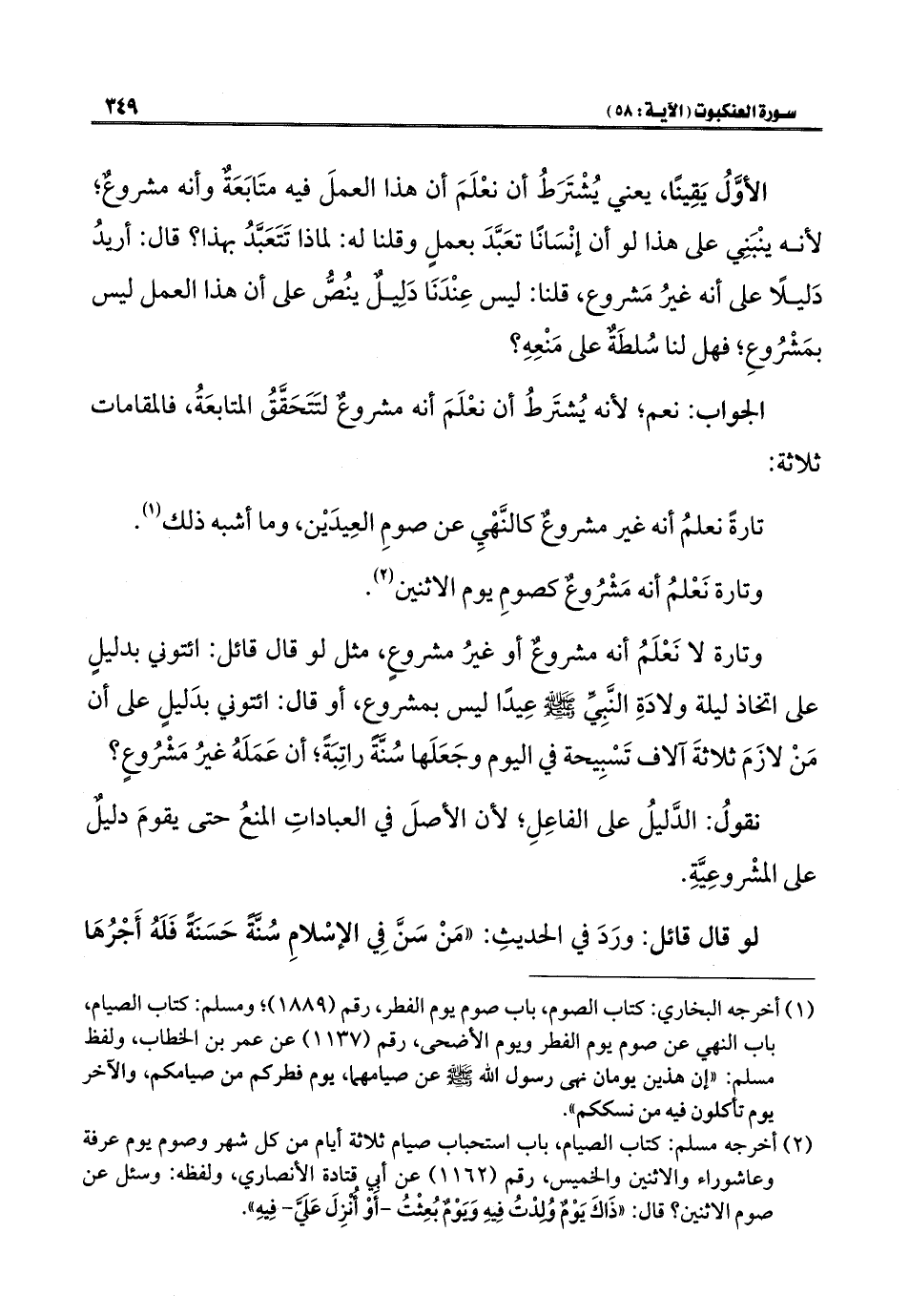 الأوَّلُ يَقِينًا، يعني يُشْتَرَطُ أن نعْلَمَ أن هذا العملَ فيه متَابَعَةٌ وأنه مشروعٌ؛ لأنه ينْبَنِي على هذا لو أن إنْسَانًا تعَبَّدَ بعملٍ وقلنا له: لماذا تَتَعَبَّدُ بهذا؟ قال: أريدُ دَليلًا على أنه غيرُ مَشروع، قلنا: ليس عِنْدَنَا دَلِيلٌ ينُصُّ على أن هذا العمل ليس بمَشْرُوعِ؛ فهل لنا سُلطَةٌ على مَنْعِهِ؟