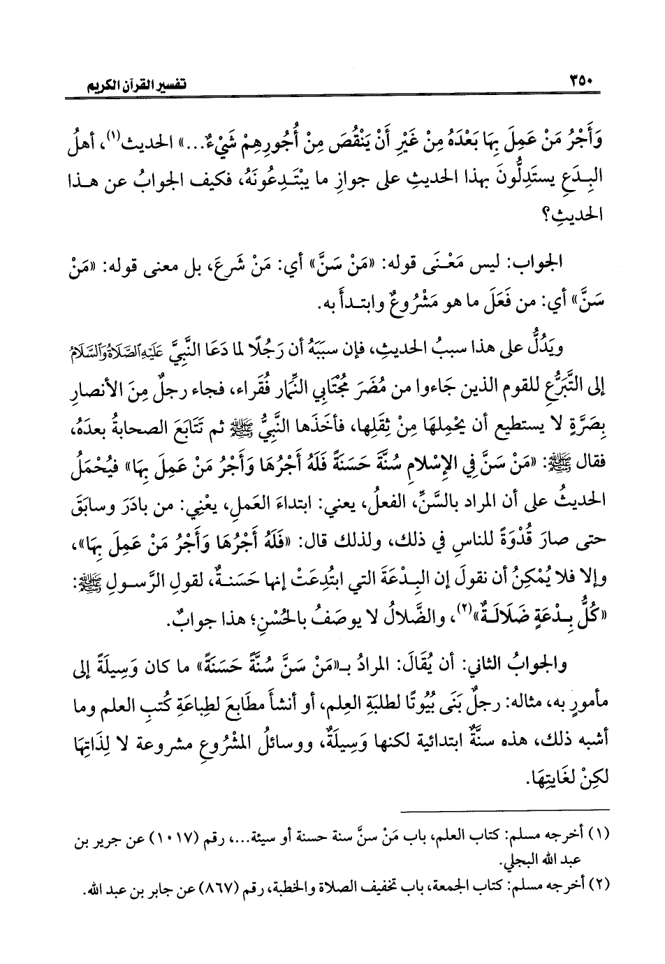 والجوابُ الثاني: أن يُقَالَ: المرادُ بـ "مَنْ سَنَّ سُنَّةً حَسَنَةً" ما كان وَسِيلَةً إلى مأمورٍ به، مثاله: رجلٌ بَنَى بُيُوتًا لطلبَةِ العِلم، أو أنشأَ مطَابِعَ لطِباعَةِ كُتبِ العلم وما أشبه ذلك، هذه سنَّةٌ ابتدائية لكنها وَسِيلَةٌ، ووسائلُ المشْرُوعِ مشروعة لا لِذَاتِهَا لكِنْ لغَايتِهَا.