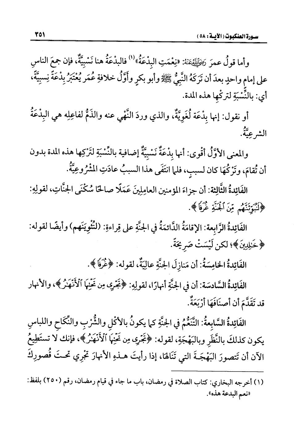 وأما قوُل عمرَ -رضي اللَّه عنه-: "نِعْمَتِ البِدْعَةُ" (¬١) فالبدْعَةُ هنا نَسْبِيَّةٌ، فإن جمعَ الناسِ على إمامٍ واحدٍ بعدَ أن تَرَكَهُ النَّبِيُّ -صلى اللَّه عليه وسلم- وأبو بكرٍ وأَوَّلُ خلافةِ عُمَر يُعْتَبَرُ بِدْعَةً نِسبِيَّةً، أي: بالنِّسْبَةِ لتركْهِا هذه المدة.
