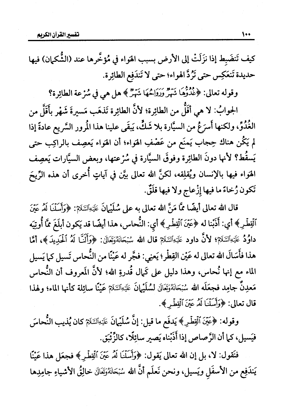 فنَقول: لا، بل إن الله تعالى يَقول: {وَأَسَلْنَا لَهُ عَيْنَ الْقِطْرِ} فجعَل هذا عَيْنًا يَندَفِع من الأسفَلِ وَيسيل، ونحن نَعلَم أنَّ الله سُبْحَانَهُ وَتَعَالَى خالِقُ الأشياءِ جامِدِها