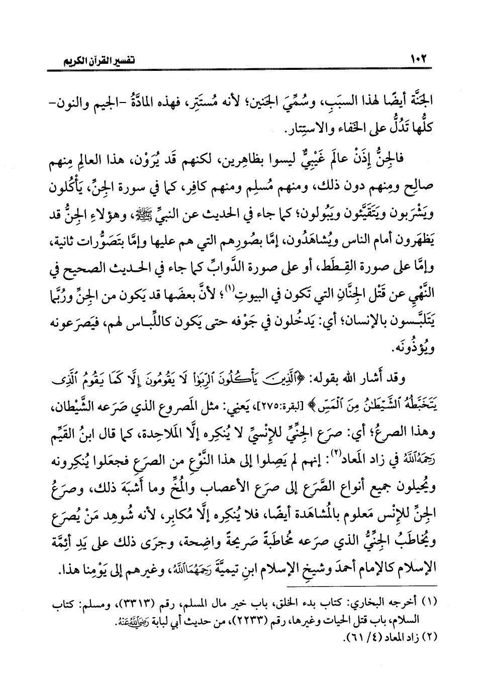 وقد أَشار الله بقوله: {الَّذِينَ يَأْكُلُونَ الرِّبَا لَا يَقُومُونَ إِلَّا كَمَا يَقُومُ الَّذِي يَتَخَبَّطُهُ الشَّيْطَانُ مِنَ الْمَسِّ} [البقرة: ٢٧٥]، يَعنِي: مثل المَصروع الذي صَرَعه الشَّيْطان، وهذا الصرعُ؛ أي: صرَع الجِنِّيَّ للإِنْسيِّ لا يُنكِره إلَّا المَلاحِدة، كما قال ابنُ القَيِّم رَحِمَهُ اللَّهُ في زاد المَعاد (¬٢): إنهم لم يَصِلوا إلى هذا النَّوْعِ من الصرَعِ فجعَلوا يُنكِرونه ويُحيلون جميع أنواع الصَّرَع إلى صرَع الأعصاب والمُخِّ وما أَشبَهَ ذلك، وصرَعُ الجِنِّ للإِنْس مَعلوم بالمُشاهَدة أيضًا، فلا يُنكِره إلَّا مُكابِر، لأنه شُوهِد مَنْ يُصرَع ويُخاطَبُ الجِنِّيُّ الذي صرَعه مُخاطَبةً صَريحةً واضِحة، وجرَى ذلك على يَدِ أئِمَّة الإسلام كالإمام أحمدَ وشيخِ الإسلام ابنِ تيميَّةَ رَحِمَهُمَا اللَّهُ، وغيرهم إلى يَوْمِنا هذا.
