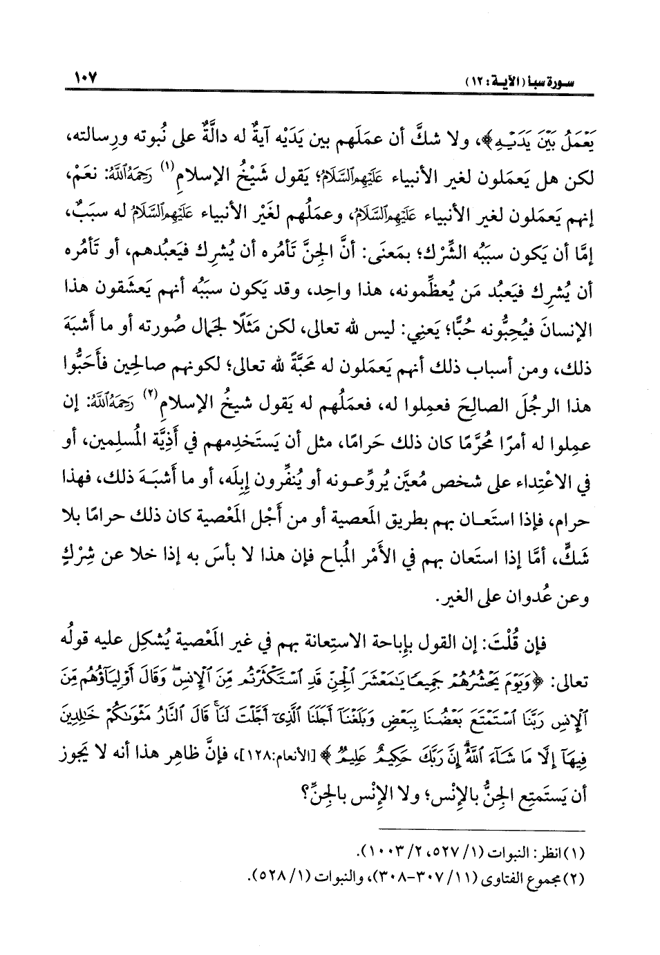يَعْمَلُ بَيْنَ يَدَيْهِ}، ولا شكَّ أن عمَلَهم بين يَدَيْه آيةٌ له دالَّةٌ على نُبوته ورِسالته، لكن هل يَعمَلون لغير الأنبياء عَلَيْهِ السَّلَامُ؛ يَقول شَيْخُ الإسلامِ (¬١) رَحِمَهُ اللَّهُ: نعَمْ، إنهم يَعمَلون لغير الأنبياء عَلَيْهِ السَّلَامُ، وعمَلُهم لغَيْر الأنبياء عَلَيْهِ السَّلَامُ له سبَبٌ، إمَّا أن يَكون سبَبُه الشِّرْك، بمَعنَى: أنَّ الجِنَّ تَأمُره أن يُشرِك فيَعبُدهم، أو تَأمُره أن يُشرِك فيَعبُد مَن يُعظِّمونه، هذا واحِد، وقد يَكون سبَبُه أنهم يَعشَقون هذا الإنسانَ فيُحِبُّونه حُبًّا؛ يَعنِي: ليس لله تعالى، لكن مَثَلاً لجَمال صُورته أو ما أَشبَهَ ذلك، ومن أسباب ذلك أنهم يَعمَلون له مَحبَّةً لله تعالى؛ لكونهم صالحِين فأَحَبُّوا هذا الرجُلَ الصالِحَ فعمِلوا له، فعمَلُهم له يَقول شيخُ الإسلامِ (¬٢) رَحِمَهُ اللَّهُ: إن عمِلوا له أمرًا مُحرَّمًا كان ذلك حَرامًا، مثل أن يَستَخدِمهم في أَذِيَّة المُسلِمين، أو في الاعْتِداء على شخص مُعيَّن يُروِّعونه أو يُنفَّرون إِبِلَه، أو ما أَشبَهَ ذلك، فهذا حرام، فإذا استَعان بهم بطريق المَعصية أو من أَجْل المَعْصية كان ذلك حرامًا بلا شَكًّ، أمَّا إذا استَعان بهم في الأَمْر المُباح فإن هذا لا بأسَ به إذا خلا عن شِرْكٍ وعن عُدوان على الغير.