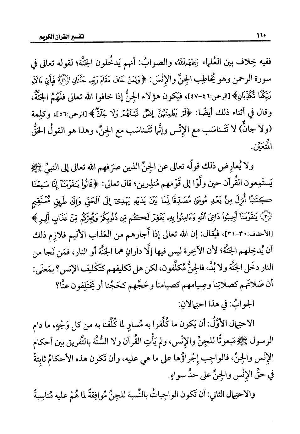 ولا يُعارِض ذلك قولُه تعالى عن الجِنِّ الذين صرَفهم الله تعالى إلى النبيِّ - صلى الله عليه وسلم - يَستَمِعون القُرآن حين ولَّوْا إلى قَوْمهم مُنذِرين؛ قال تعالى: {قَالُوا يَاقَوْمَنَا إِنَّا سَمِعْنَا كِتَابًا أُنْزِلَ مِنْ بَعْدِ مُوسَى مُصَدِّقًا لِمَا بَيْنَ يَدَيْهِ يَهْدِي إِلَى الْحَقِّ وَإِلَى طَرِيقٍ مُسْتَقِيمٍ (٣٠) يَاقَوْمَنَا أَجِيبُوا دَاعِيَ اللَّهِ وَآمِنُوا بِهِ يَغْفِرْ لَكُمْ مِنْ ذُنُوبِكُمْ وَيُجِرْكُمْ مِنْ عَذَابٍ أَلِيمٍ} [الأحقاف: ٣٠ - ٣١]، فيُقال: إن الله تعالى إذا أَجارهم من العَذاب الأليم فلازِم ذلك أن يُدخِلهم الجَنَّة؛ لأن الآخِرة ليس فيها إلَّا دارانِ هما الجَنَّة أو النار، فمَن نَجا من النار دخَل الجَنَّة ولا بُدَّ، فالجِنُّ مُكلَّفون، لكن هل تَكليفهم كتَكليف الإنس؟ بمَعنَى: أن صَلاتَهم كصلاتِنا وصِيامهم كصيامنا وحَجَّهم كحَجِّنا أو يَختَلِفون عنَّا؟