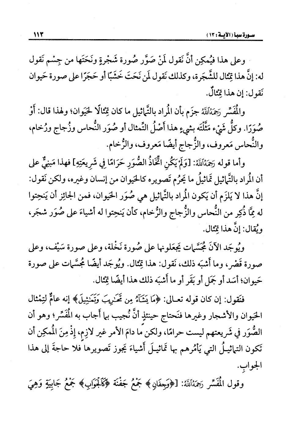 فنَقول: إن كان قوله تعالى: {مَا يَشَاءُ مِنْ مَحَارِيبَ وَتَمَاثِيلَ} إنه عامٌّ لتِمْثال الحَيوان والأشجار وغيرها فنَحتاج حينئذٍ أنَّ نُجيب بما أَجاب به المُفَسِّر؛ وهو أن الصُّوَر في شَريعتهم ليست حرامًا، ولكنً ما دامَ الأمر غير لازِمٍ، إِذْ مِنَ المُمكِن أن تَكون التماثيلُ التي يَأمُرهم بها تَماثيلَ أَشياءَ يَجوز تَصويرها فلا حاجةَ إلى هذا الجوابِ.