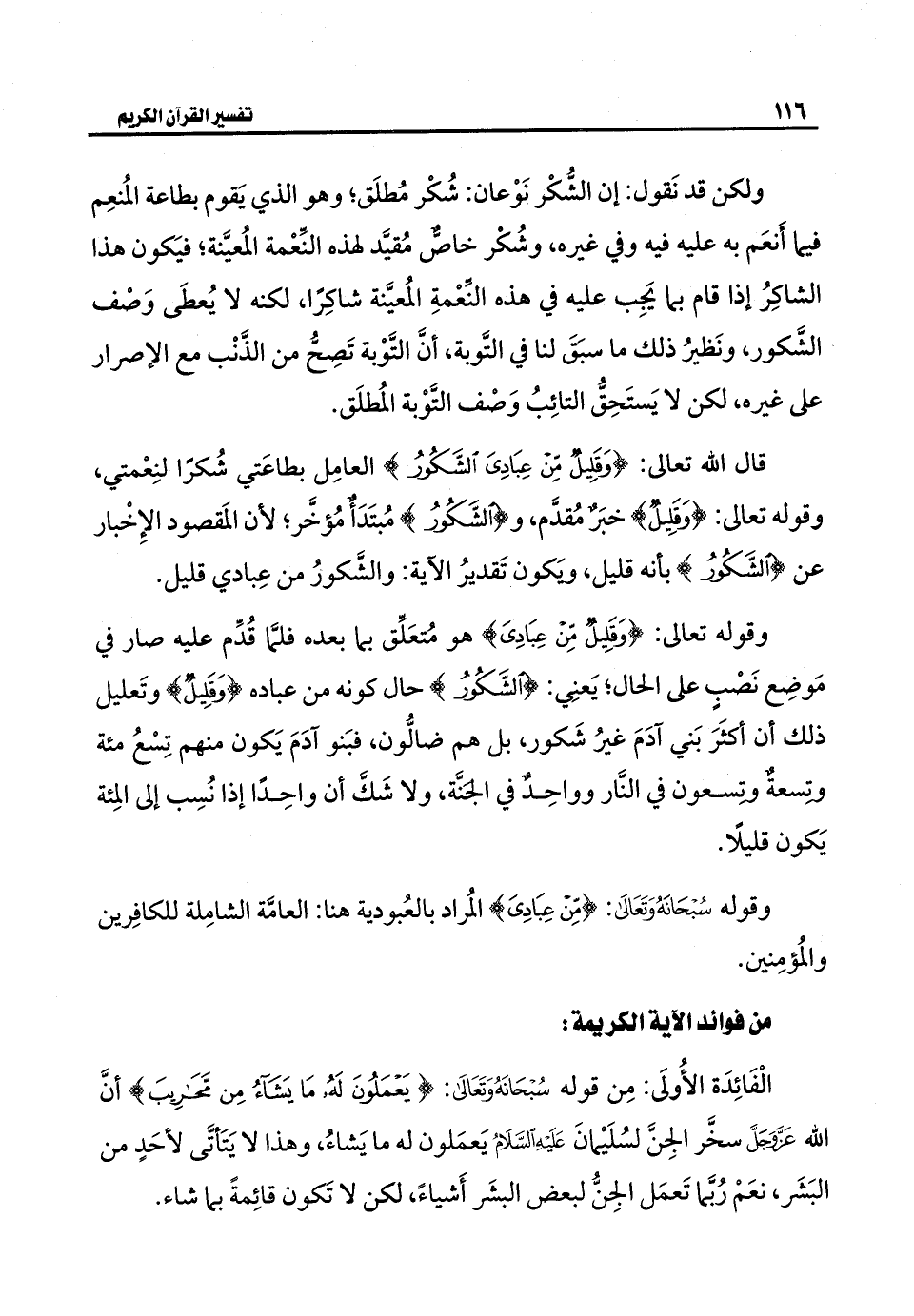 قال الله تعالى: {وَقَلِيلٌ مِنْ عِبَادِيَ الشَّكُورُ} العامِل بطاعَتي شُكرًا لنِعْمتي، وقوله تعالى: {وَقَلِيلٌ} خبَرٌ مُقدَّم، و {الشَّكُورُ} هو مُبتَدَأ مُؤخَّر؛ لأن المَقصود الإِخْبار عن {الشَّكُورُ} بأنه قليل، ويَكون تَقديرُ الآية: والشَّكورُ من عِبادي قليل.