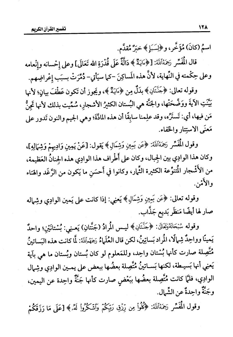 وقوله سُبْحَانَهُ وَتَعَالَى: {جَنَّتَانِ} ليس المُرادُ (جَنَّتانِ) يَعنِي: بُسْتانَيْنِ؛ واحدٌ يَمينًا وواحِدٌ شِمالًا، المُراد بَساتِينُ، لكن قال العُلَماءُ رَحِمَهُ اللَّهُ: لمَّا كانت هذه البَساتينُ مُتَّصِلة صارت كأنها بُسْتان واحِد، وللمَعلوم لو كان بُستان وبُستان ما هي بآية يَعنِي أنها بَسيطة، لكنها بَساتينُ مُتَّصِلة بعضُها ببعض على يمين الوادِي وشِمال الوادِي، فلمَّا كانت مُتَّصِلة بعضُها ببَعْضٍ صارت كانها جَنَّه واحِدة عن اليمين، وجَنَّة واحِدةٌ عن الشِّمال.