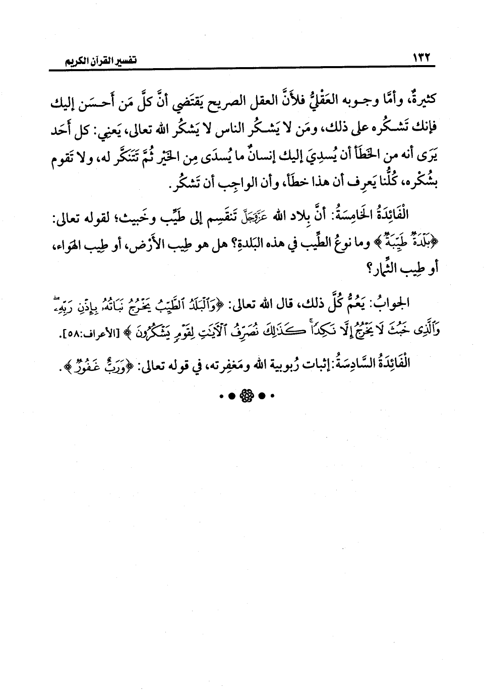الْفَائِدَةُ الخَامِسَةُ: أنَّ بِلاد الله عَزَّ وَجَلَّ تَنقَسِم إلى طَيَّب وخَبيث؛ لقوله تعالى: {بَلْدَةٌ طَيِّبَةٌ} وما نوعُ الطَّيب في هذه البَلدةِ؟ هل هو طِيب الأَرْض، أو طِيب الهَواء، أو طِيب الثَّمار؟
