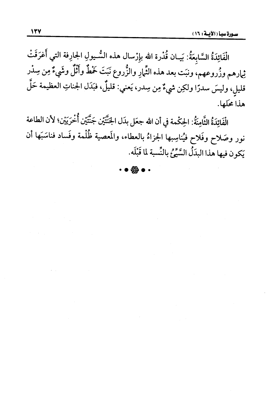 الْفَائِدَةُ السَّابِعَةُ: بَيان قُدْرة الله بإِرْسال هذه السُّيولِ الجارِفة التي أَغرَقَتْ ثِمارهم وزُروعهم، ونبَت بعد هذه الثِّمارِ والزُّروع نَبَتَ خَمْطٌ وأَثْلٌ وشَيءٌ مِن سِدْر قليلٍ، وليسَ سدرًا ولكِن شيءٌ مِن سِدر، يَعني: قليلٌ، فبَدَل الجناتِ العظيمة حَلَّ هذا محَلها.