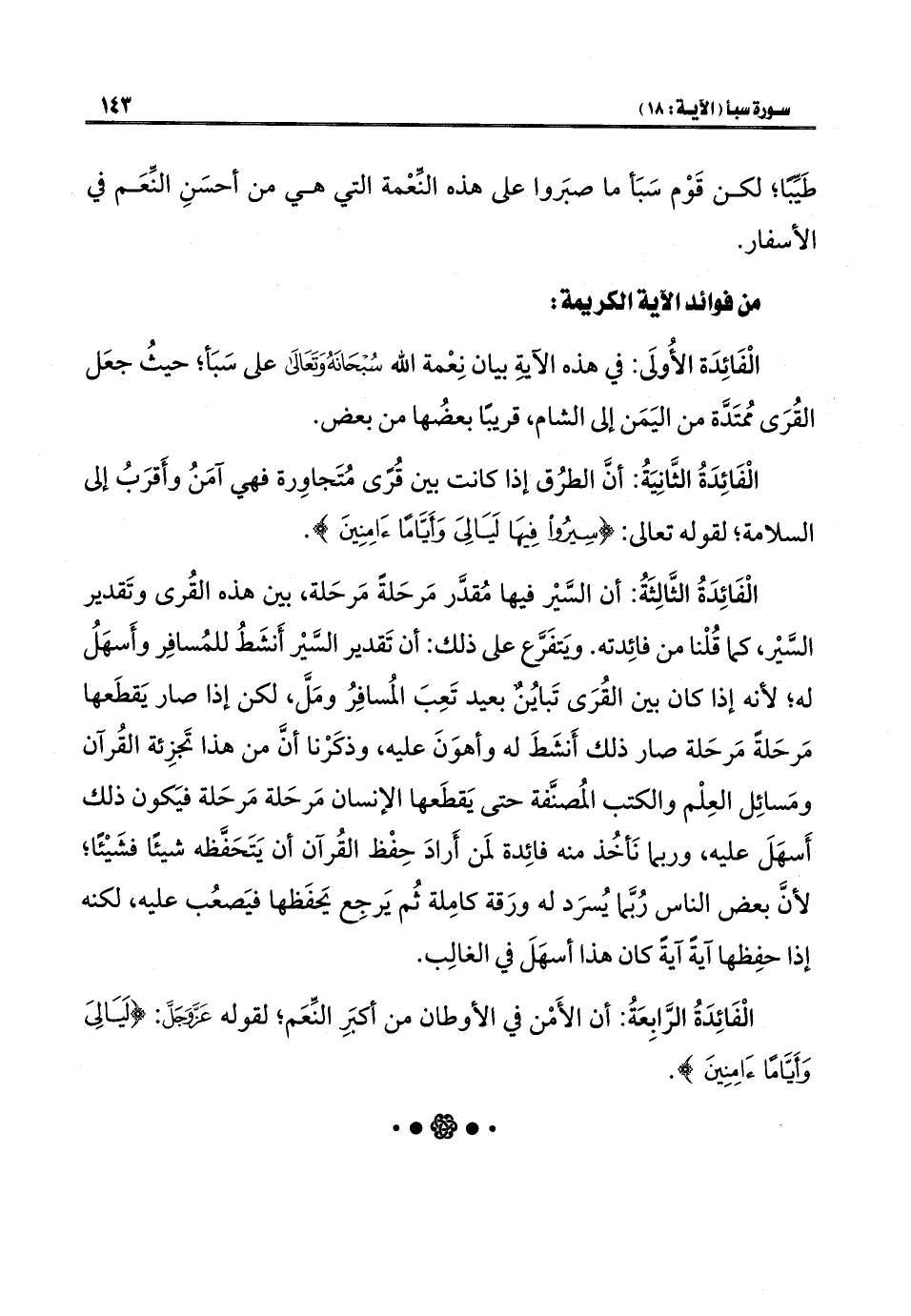 الْفَائِدَةُ الثَّانِيَةُ: أنَّ الطرُق إذا كانت بين قُرًى مُتَجاوِرة فهي آمَنُ وأَقرَبُ إلى السلامة؛ لقوله تعالى: {سِيرُوا فِيهَا لَيَالِيَ وَأَيَّامًا آمِنِينَ}.