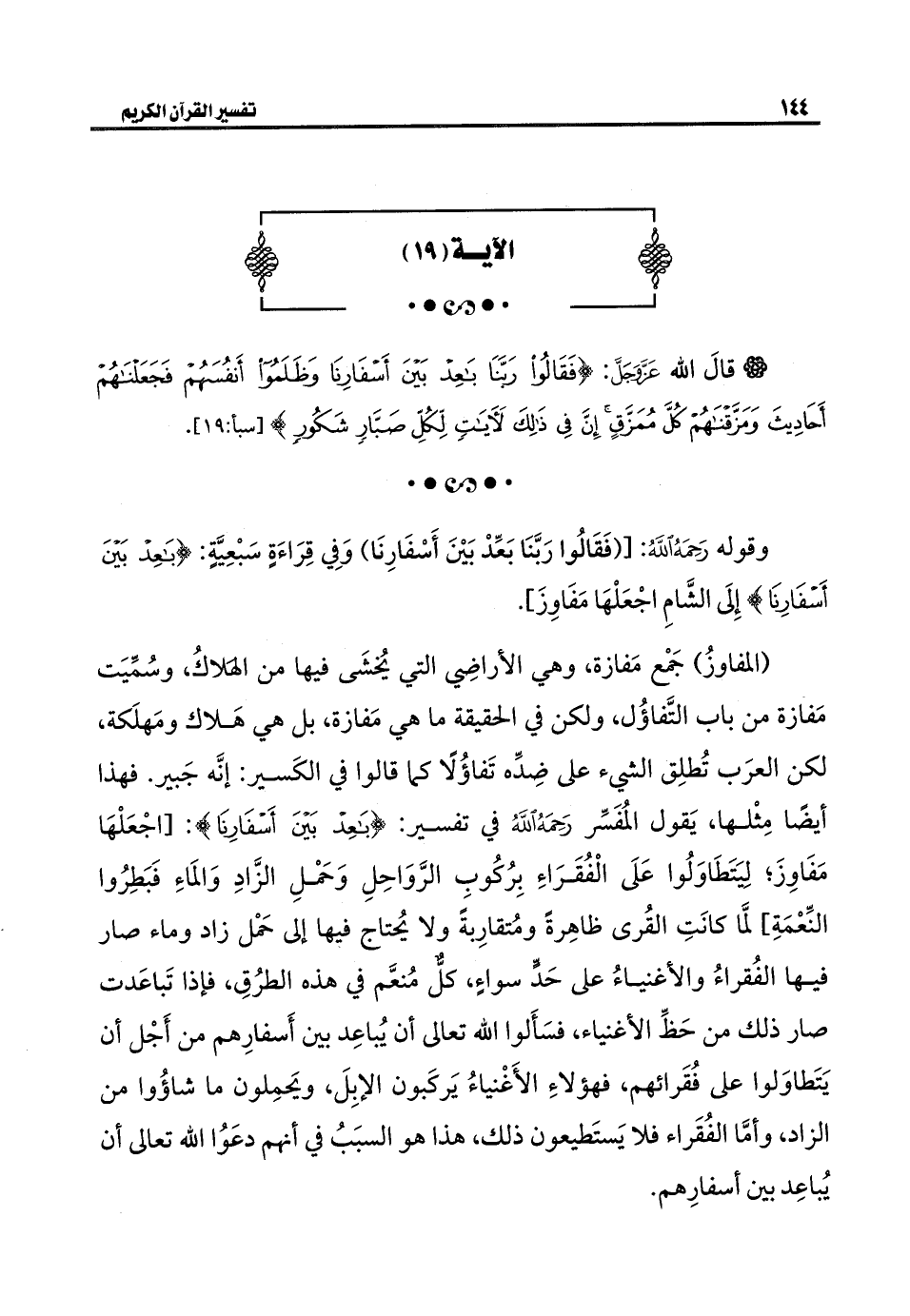 {(المفاوزُ) جَمْع مَفازة، وهي الأراضِي التي يُخشَى فيها من الهَلاكُ، وسُمِّيَت مَفازة من باب التَّفاؤُل، ولكن في الحقيقة ما هي مَفازة، بل هي هَلاك ومَهلَكة، لكن العرَب تُطلِق الشيء على ضِدِّه تَفاؤُلًا كما قالوا في الكَسير: إنَّه جَبير. فهذا أيضًا مِثْلها، يَقول المُفَسِّر رَحِمَهُ اللَّهُ في تفسير: {بَاعِدْ بَيْنَ أَسْفَارِنَا}: [اجْعَلْهَا مَفَاوِزَ؛ لِيَتَطَاوَلُوا عَلَى الْفُقَرَاءِ بِرُكُوبِ الرَّوَاحِلِ وَحَمْلِ الزَّادِ وَالمَاءِ فَبَطِرُوا النِّعْمَةِ] لمَّا كانَتِ القُرى ظاهِرةً ومُتقارِبةً ولا يُحتاج فيها إلى حَمْل زاد وماء صار فيها الفُقراءُ والأغنياءُ على حَدٍّ سواءٍ، كلٌّ مُنعَّم في هذه الطرُقِ، فإذا تَباعَدت صار ذلك من حَظِّ الأغنياء، فسَأَلوا الله تعالى أن يُباعِد بين أَسفارِهم من أَجْل أن يَتَطاوَلوا على فُقَرائهم، فهؤلاءِ الأَغْنياءُ يَركَبون الإبِلَ، ويَحمِلون ما شاؤُوا من الزاد، وأمَّا الفُقَراء فلا يَستَطيعون ذلك، هذا هو السبَبُ في أنهم دعَوُا الله تعالى أن يُباعِد بين أسفارِهم.