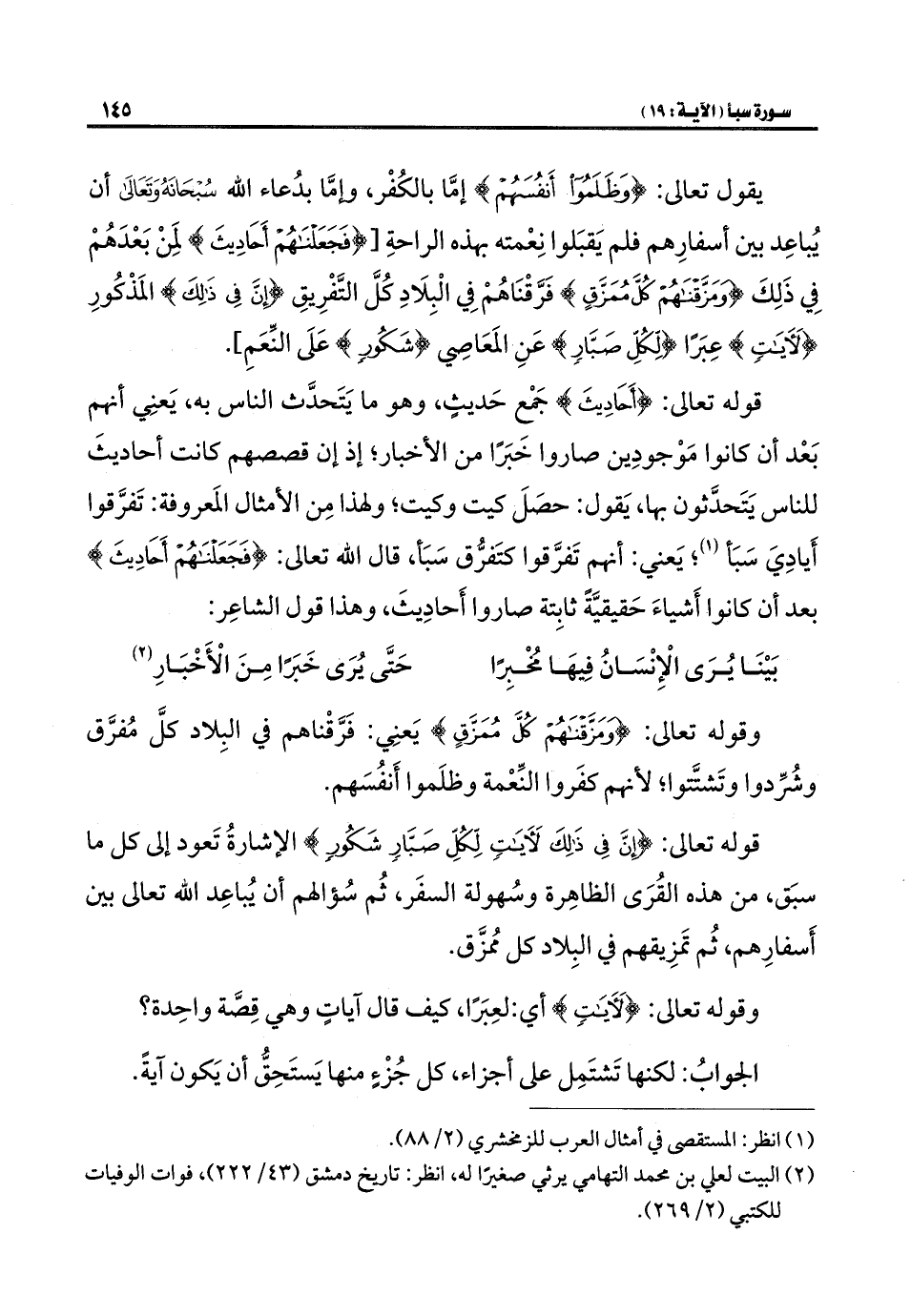 يقول تعالى: {وَظَلَمُوا أَنْفُسَهُمْ} إمَّا بالكُفْر، وإمَّا بدُعاء الله سُبْحَانَهُ وَتَعَالَى أن يُباعِد بين أسفارِهم فلم يَقبَلوا نِعْمته بهذه الراحةِ [{فَجَعَلْنَاهُمْ أَحَادِيثَ} لَمِنْ بَعْدَهُمْ فِي ذَلِكَ {وَمَزَّقْنَاهُمْ كُلَّ مُمَزَّقٍ} فَرَّقْنَاهُمْ فِي الْبِلَادِ كُلَّ التَّفْرِيقِ {إِنَّ فِي ذَلِكَ} المَذْكُورِ {لَآيَاتٍ} عِبَرًا {لِكُلِّ صَبَّارٍ} عَنِ المَعَاصِي {شَكُورٍ} عَلَى النِّعَمِ].