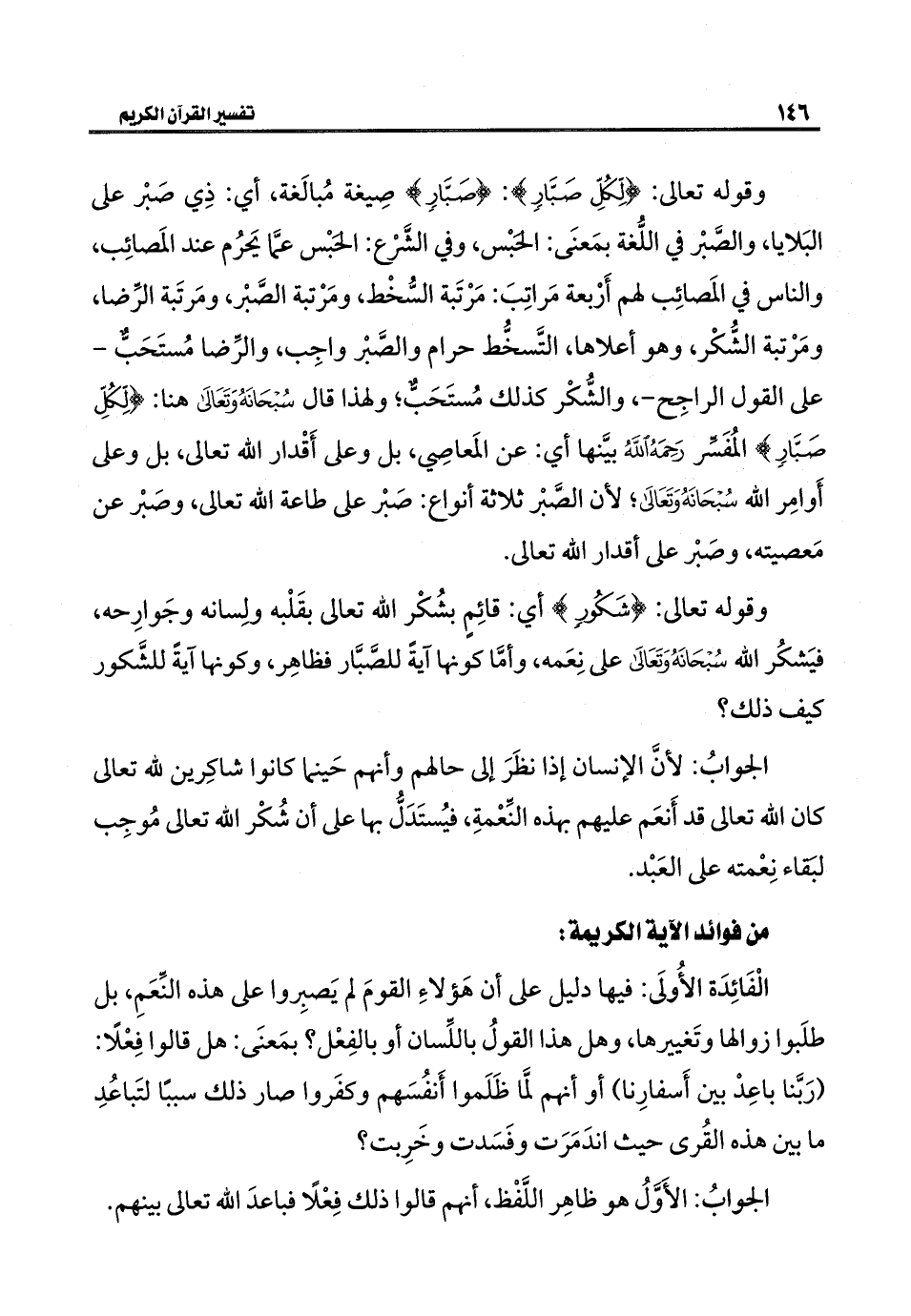 وقوله تعالى: {لِكُلِّ صَبَّارٍ}: {صَبَّارٍ} صِيغة مُبالَغة، أي: ذِي صَبْر على البَلايا، والصَّبْر في اللُّغة بمَعنَى: الحَبْس، وفي الشَّرْع: الحَبْس عمَّا يَحرُم عند المَصائِب، والناس في المَصائِب لهم أَرْبعة مَراتِبَ: مَرْتَبة السُّخْط، ومَرْتبة الصَّبْر، ومَرتَبة الرِّضا، ومَرْتبة الشُّكْر، وهو أعلاها، التَّسخُّط حرام والصَّبْر واجِب، والرِّضا مُستَحَبٌّ -على القول الراجِح-، والشُّكْر كذلك مُستَحَبٌّ، ولهذا قال سُبْحَانَهُ وَتَعَالَى هنا: {لِكُلِّ صَبَّارٍ} المُفَسِّر رَحِمَهُ اللَّهُ بيَّنها أي: عن المَعاصِي، بل وعلى أَقْدار الله تعالى، بل وعلى أَوامِر الله سُبْحَانَهُ وَتَعَالَى، لأن الصَّبْر ثلاثة أنواع: صَبْر على طاعة الله تعالى، وصَبْر عن مَعصيته، وصَبْر على أقدار الله تعالى.