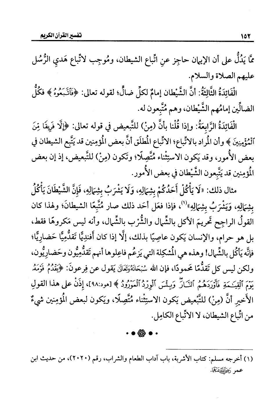مثال ذلك: "لَا يَأْكلْ أَحَدُكُمْ بِشِمَالِهِ، وَلَا يَشْرَبُ بِشِمالِهِ، فَإِنَّ الشَّيْطَانَ يَأْكلُ بِشِمَالِهِ، وَيَشْرَبُ بِشِمَالِهِ" (¬١)، فإذا فعَل أحَد ذلك صار مُتَّبِعًا الشيطانَ؛ ولهذا كان القولُ الراجِح تَحريمَ أكل بالشِّمال والشُّرْب بالشِّمال، وأنه ليس مَكروهًا فقط، بل هو حرام، والإنسان يَكون عاصِيًا بذلك، إلَّا إذا كان أَفندِيًّا تَقدُّمِيًّا حَضارِيًّا؛ فإنَّه يَأكُل بالشِّمال! وهذه هي المُشكِلة التي يَزعُم فاعِلوها أنهم تَقدُّمِيُّون وحَضارِيُّون، ولكن ليس كل تَقدُّمًا محَمودًا، فإن الله -سُبْحَانَهُ وَتَعَالَى- يَقول عن فِرعونَ: {يَقْدُمُ قَوْمَهُ يَوْمَ الْقِيَامَةِ فَأَوْرَدَهُمُ النَّارَ وَبِئْسَ الْوِرْدُ الْمَوْرُودُ} [هود: ٩٨]، إِذَنْ على هذا القولِ الأَخيرِ أنَّ (مِنْ) للتَّبْعيض يَكون الاستِثْناء مُتَّصِلًا، وَيكون لبعض المُؤمِنين شيءٌ من اتِّباع الشيطان، لا الاتِّباع الكامِل.