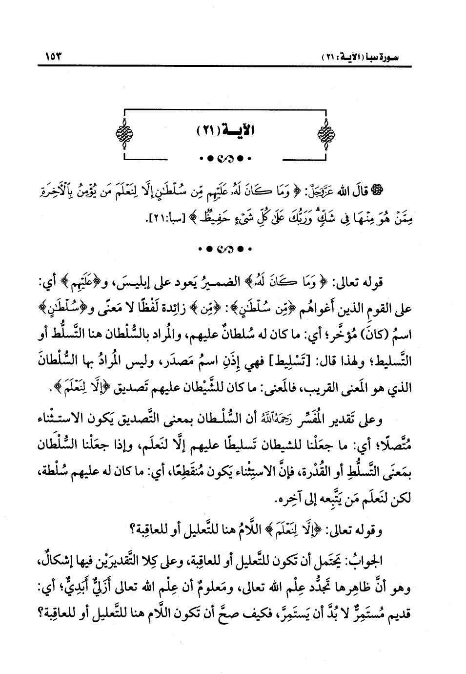 قوله تعالى: {وَمَا كَانَ لَهُ} الضميرُ يَعود على إبليسَ، و {عَلَيْهِمْ} أي: على القومِ الذين أَغواهُم {مِنْ سُلْطَانٍ}: {مِنْ} زائِدة لَفْظًا لا مَعنًى و {سُلْطَانٍ} اسمُ (كانَ) مُؤخِّر؛ أي: ما كان له سُلطانٌ عليهم، والمُراد بالسُّلْطان هنا التَّسلُّط أو التَّسليط؛ ولهذا قال: [تَسْلِيط] فهي إِذَنِ اسمُ مَصدَر، وليس المُرادُ بها السُّلْطانَ الذي هو المَعنى القريب، فالمَعنى: ما كان للشَّيْطان عليهم تَصديق {إِلَّا لِنَعْلَمَ}.