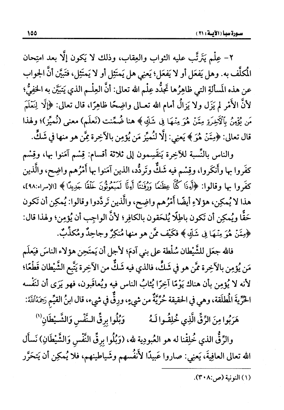 فالله جعَل للشَّيْطان سُلْطة عليّ بني آدمَ؛ لأجل أن يَمتَحِن هؤلاء النَّاسَ فيَعلَم مَن يُؤمِن بالآخِرة ممن هو في شَكٍّ، فالذي فيه شَكَّ من الآخِرة يَتَبع الشَّيْطان قَطْعًا؛ لأنَّه لا يُؤمِن بأن هناك يَوْمًا آخِرَا يُثابُ النَّاس فيه ويُعاقَبون، فهو يَرَى أن لنَفْسه الحُريةَ المُطلَقة، وهي في الحقيقة حُرِّيةٌ من شيءٍ، ورِقٌّ في شيء، قال ابنُ القيمِ -رَحِمَهُ اللهُ-: