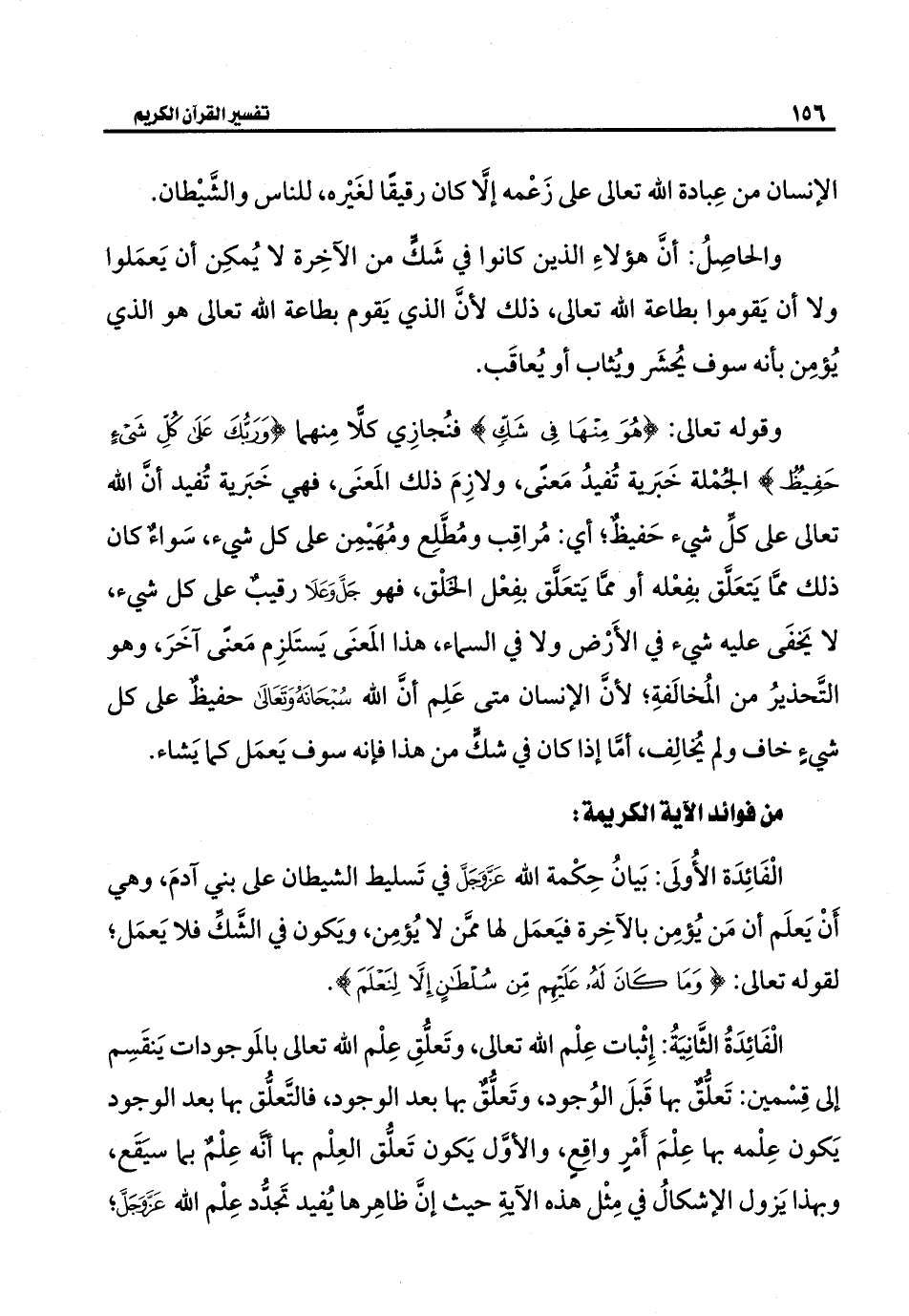 وقوله تعالى: {هُوَ مِنْهَا فِي شَكٍّ} فنُجازِي كلًّا مِنهما {وَرَبُّكَ عَلَى كُلِّ شَيْءٍ حَفِيظٌ} الجُمْلة خَبَرية تُفيدُ مَعنًى، ولازِمَ ذلك المَعنَى، فهي خَبَرية تُفيد أن الله تعالى على كلِّ شيء حَفيظ؛ أي: مُراقِب ومُطلِع ومهيْمِن على كل شيء، سَواء كان ذلك ممَّا يَتعَلق بفِعْله أوْ ممَّا يَتعَلق بفِعْل الخلْق، فهو جلَّ وَعَلَا رقيب على كل شيء، لا يَخفَى عليه شيء في الأَرْض ولا في السماء، هذا المَعنَى يَستَلزِم مَعنًى آخَرَ، وهو التَحذيرُ من المُخالَفةِ؛ لأنَّ الإنسان متى عَلِم أنَّ الله -سُبْحَانَهُ وَتَعَالَى- حفيظٌ على كل شيءٍ خاف ولم يُخالِف، أمَّا إذا كان في شكٍّ من هذا فإنَّه سوف يَعمَل كما يَشاء.