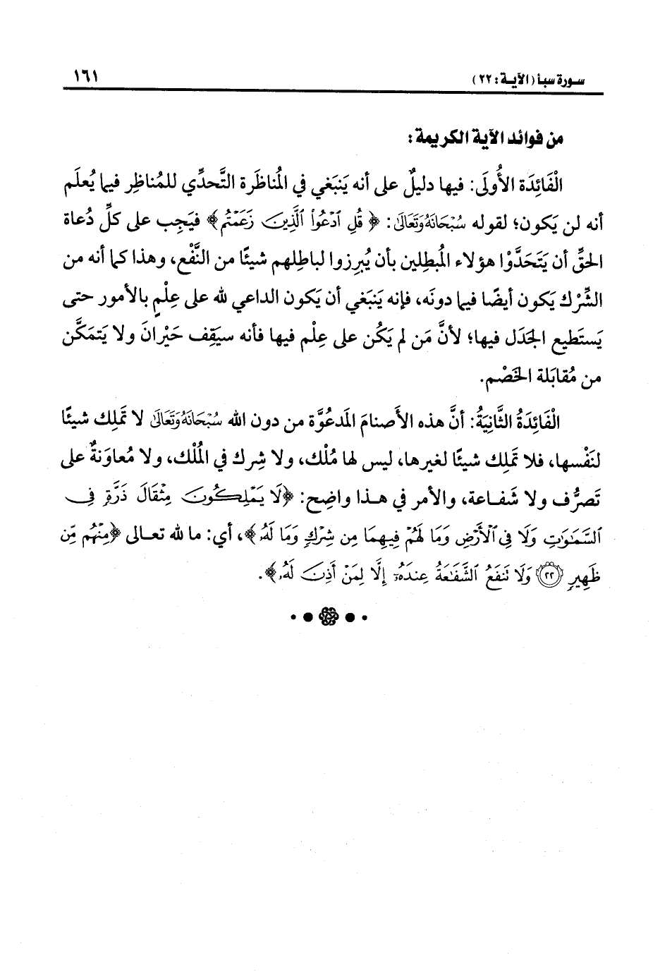 الْفَائِدَةُ الثَّانِيَةُ: أنَّ هذه الأَصنامَ المَدعُوَّة من دون الله -سُبْحَانَهُ وَتَعَالَى- لا تَملِك شيئًا لنَفْسها، فلا تَملِك شيئًا لغيرها، ليس لها مُلْك، ولا شِرك في المُلْك، ولا مُعاوَنةٌ على تَصرُّف ولا شَفاعة، والأمر في هذا واضِح: {لَا يَمْلِكُونَ مِثْقَالَ ذَرَّةٍ فِي السَّمَاوَاتِ وَلَا فِي الْأَرْضِ وَمَا لَهُمْ فِيهِمَا مِنْ شِرْكٍ وَمَا لَهُ}، أي: ما لله تعالى {مِنْهُمْ مِنْ ظَهِيرٍ (٢٢) وَلَا تَنْفَعُ الشَّفَاعَةُ عِنْدَهُ إِلَّا لِمَنْ أَذِنَ لَهُ}.