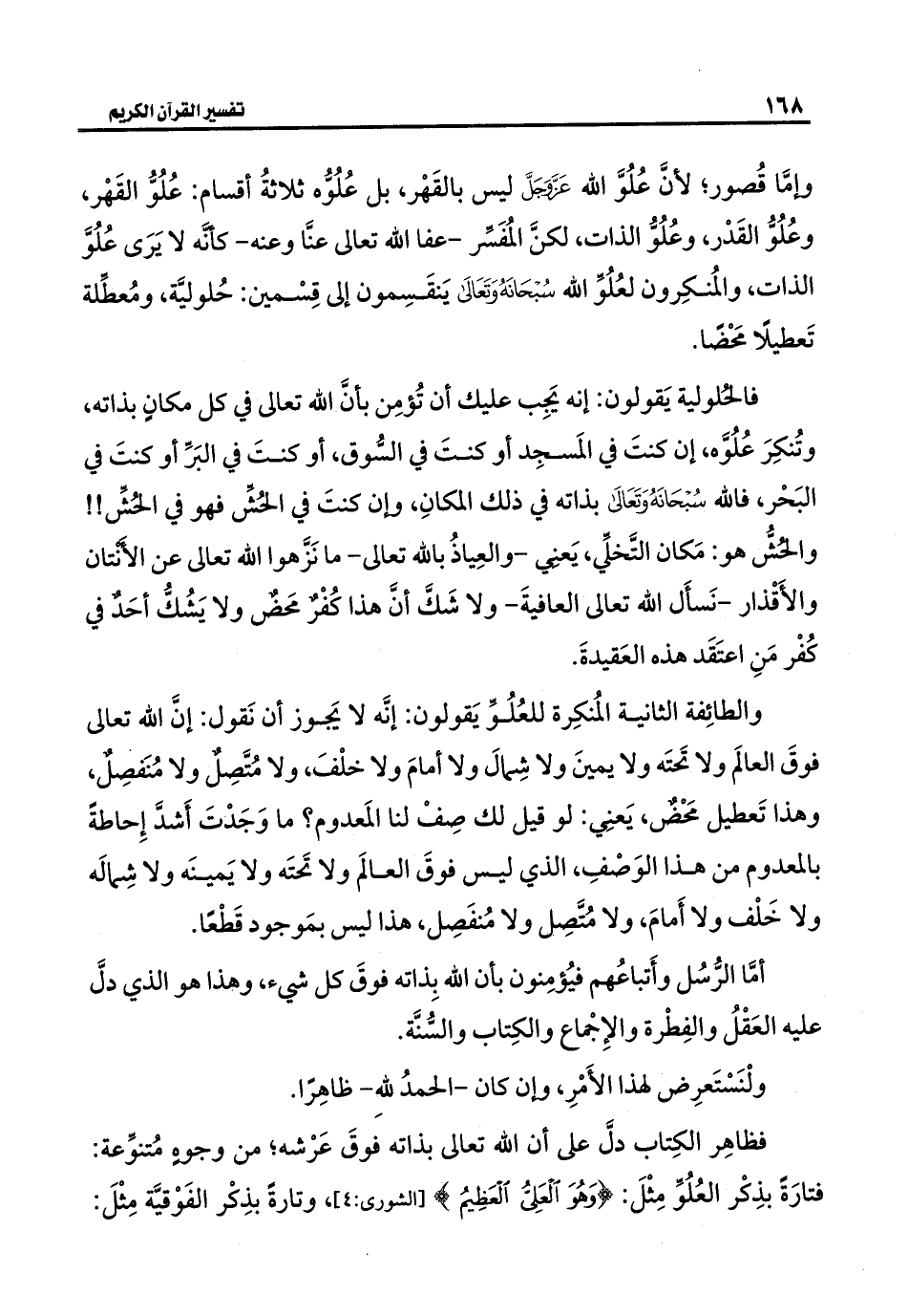 وإمَّا قُصور؛ لأنَّ عُلُوَّ الله -عَزَّ وَجَلَّ- ليس بالقَهْر، بل عُلُوُّه ثلاثةُ أقسام: عُلُوُّ القَهْر، وعُلُوُّ القَدْر، وعُلُوُّ الذّات، لكنَّ المُفَسِّر -عفا الله تعالى عنَّا وعنه- كأنَّه لا يَرَى عُلُوَّ الذّات، والمُنكِرون لعُلُو الله -سُبْحَانَهُ وَتَعَالَى- يَنقَسِمون إلى قِسْمين: حُلوليَّة، ومُعطلة تَعطيلًا مَحْضًا.