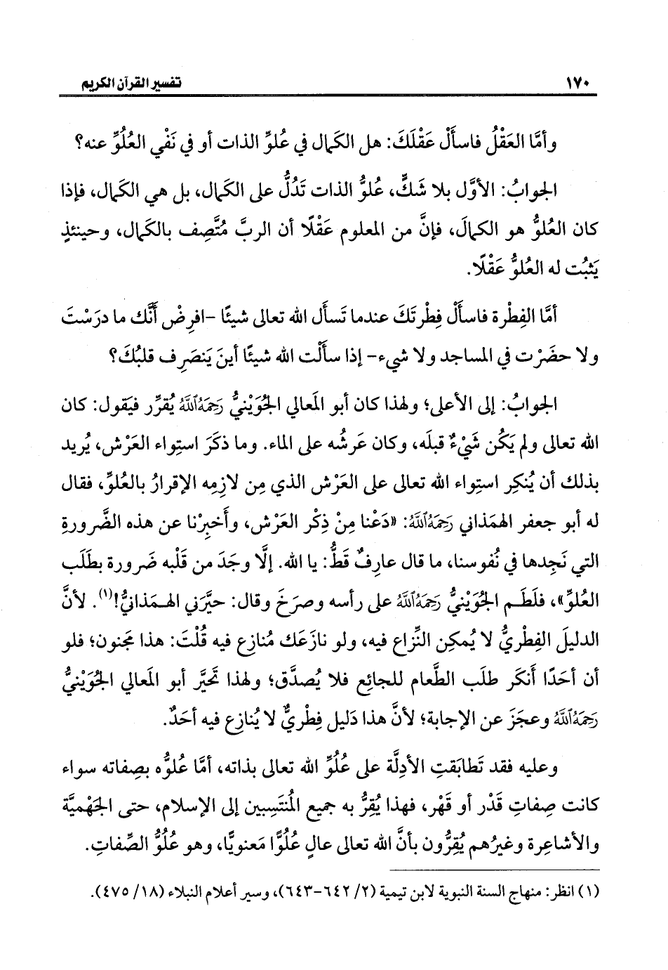 الجوابُ: إلى الأعلى؛ ولهذا كان أبو المَعالي الجوَيْنيُّ -رَحِمَهُ اللهُ- يُقرِّر فيَقول: كان الله تعالى ولم يَكُن شيْءٌ قبلَه، وكان عَرشُه على الماء. وما ذكَرَ استِواء العَرْش، يُريد بذلك أن يُنكِر استِواء الله تعالى على العَرْش الذي مِن لازِمِه الإقرارُ بالعُلوّ، فقال له أبو جعفر الهمَذاني -رَحِمَهُ اللهُ-: "دَعْنا مِنْ ذِكْر العَرْش، وأَخبِرْنا عن هذه الضَّرورةِ التي نَجِدها في نُفوسنا، ما قال عارِفٌ قَطُّ: يا الله. إلَّا وجَدَ من قَلْبه ضَرورة بطَلَب العُلوّ"، فلَطَم الجُوَيْنيُّ -رَحِمَهُ اللهُ- على رأسه وصرَخَ وقال: حيَّرَني الهمَذانيُّ! (¬١). لأنَّ الدليلَ الفِطْريُّ لا يُمكِن النِّزاع فيه، ولو نازَعَك مُنازع فيه قُلْتَ: هذا مجَنون؛ فلو أن أحَدًا أَنكَر طلَب الطَّعام للجائِع فلا يُصدَّق؛ ولهذا تَحيَّر أبو المَعالي الجوَيْنيُّ -رَحِمَهُ اللهُ- وعجَزَ عن الإجابة؛ لأنَّ هذا دَليل فِطْريٌّ لا يُنازع فيه أحَدٌ.