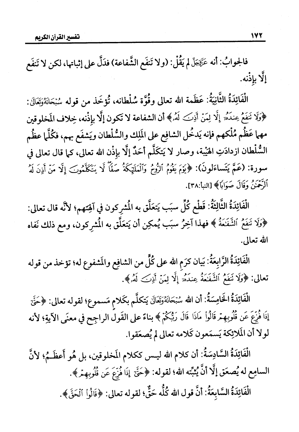 الْفَائِدَةُ الثَّانِيَةُ: عَظَمة الله تعالى وقُوَّة سُلْطانه، تُؤخَذ من قوله -سُبْحَانَهُ وَتَعَالَى-: {وَلَا تَنْفَعُ الشَّفَاعَةُ عِنْدَهُ إِلَّا لِمَنْ أَذِنَ لَهُ} أن الشفاعة لا تكون إلَّا بإذْنه، خِلاف المَخلوقين مهما عَظُم مُلْكهم فإنَّه يَدخُل الشافِع على المَلِك والسُّلْطان وَيشفَع بهم، فكُلَّما عظُم السُّلْطان ازدادَتِ الهَيْبة، وصار لا يَتكَلَّم أحَدٌ إلَّا بإِذْن الله تعالى، كما قال تعالى في سورة: (عَمَّ يَتَساءَلونَ): {يَوْمَ يَقُومُ الرُّوحُ وَالْمَلَائِكَةُ صَفًّا لَا يَتَكَلَّمُونَ إِلَّا مَنْ أَذِنَ لَهُ الرَّحْمَنُ وَقَالَ صَوَابًا} [النبأ: ٣٨].