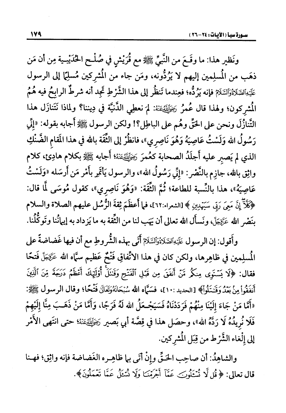 وأَقول: إن الرسول -عَلَيْهِ الصَّلَاةُ وَالسَّلَامُ- أَتَى بهذه الشُّروطِ مع أن فيها غَضاضةً على المُسلِمين في ظاهِرها، ولكن كان في هذا الاتِّفاقِ فَتْح عَظيم سمَّاه الله -عَزَّ وَجَلَّ- فَتحًا فقال: {لَا يَسْتَوِي مِنْكُمْ مَنْ أَنْفَقَ مِنْ قَبْلِ الْفَتْحِ وَقَاتَلَ أُولَئِكَ أَعْظَمُ دَرَجَةً مِنَ الَّذِينَ أَنْفَقُوا مِنْ بَعْدُ وَقَاتَلُوا} [الحديد: ١٠]، فسَمَّاه الله -سُبْحَانَهُ وَتَعَالَى- فَتْحًا؛ وقال الرسول - صلى الله عليه وسلم -: "أَمَّا مَنْ جَاءَ إِلَيْنَا مِنْهُمْ فَرَدَدْنَاهُ فَسَيَجْعَلُ الله لَهُ فَرَجًا، وَأَمَّا مَنْ ذَهَبَ مِنَّا إِلَيْهِمْ فَلَا نُرِيدُهُ لَا رَدَّهُ الله"، وحصَل هذا في قِصَّة أبي بَصير - رضي الله عنه -؛ حتَّى انتَهى الأَمْر إلى إِلْغاء الشَّرْط من قِبَل المُشرِكين.