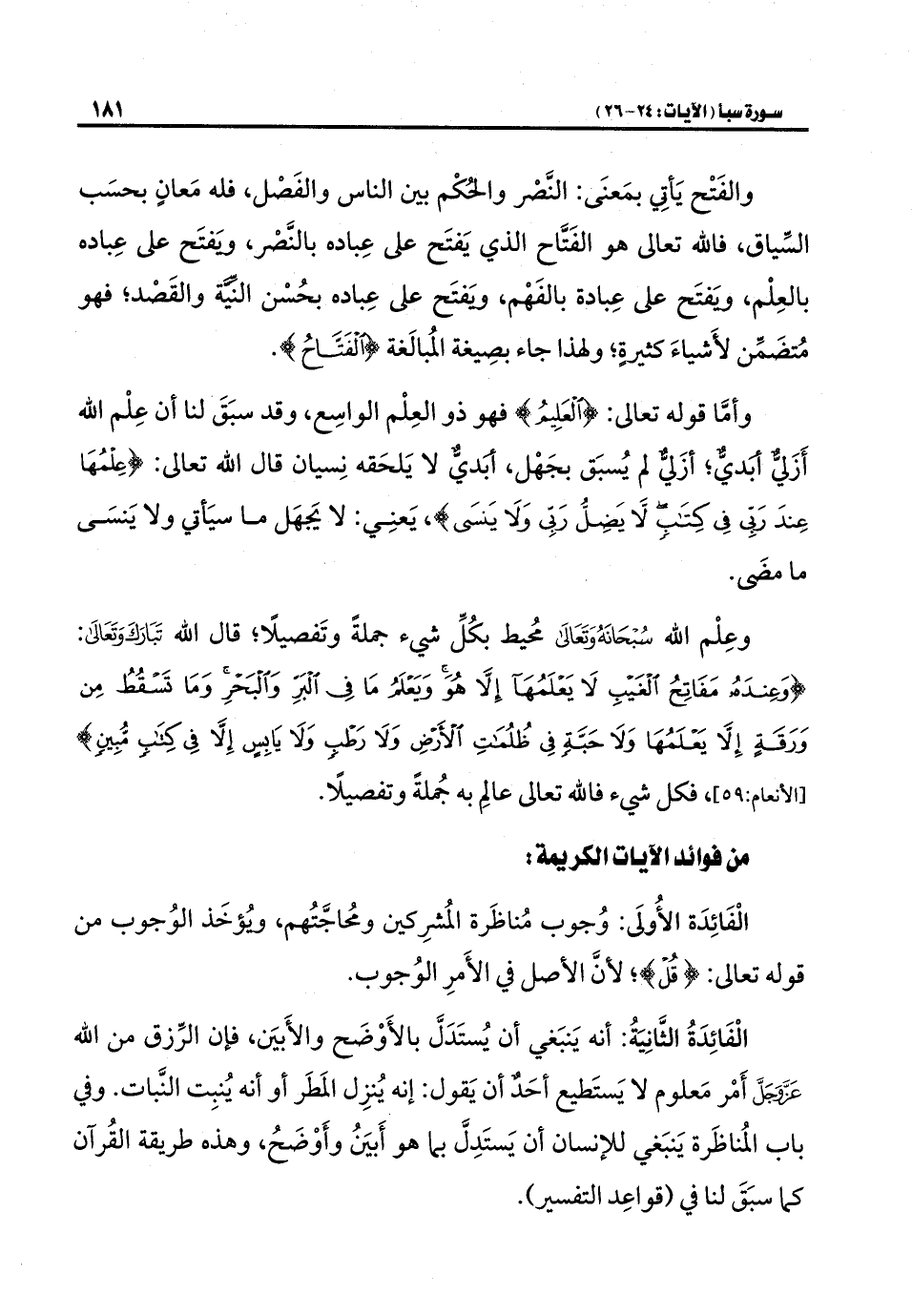 الْفَائِدَةُ الثَّانِيَةُ: أنَّه يَنبَغي أن يُستَدَلَّ بالأَوْضَح والأَبيَن، فإن الرِّزق من الله -عَزَّ وَجَلَّ- أَمْر مَعلوم لا يَستَطيع أحَدٌ أن يَقول: إنَّه يُنزِل المَطَر أو أنَّه يُنبِت النَّبات. وفي باب المُناظَرة يَنبَغي للإنسان أن يَستَدِلَّ بما هو أَبيَنُ وأَوْضَحُ، وهذه طريقة القُرآن كما سبَقَ لنا في (قواعِد التفسير).