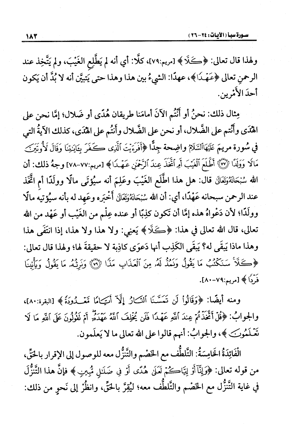 مِثال ذلك: نحنُ أو أَنْتُم الآنَ أمامَنا طريقان هُدًى أو ضَلال؛ إمَّا نحن على الهُدى وأنتم على الضَّلال، أو نحن على الضَّلال وأَنتُم على الهُدى، كذلك الآيةُ التي في سُورة مريمَ -عَلَيْهَا السَّلَامُ- واضِحة جِدًّا {أَفَرَأَيْتَ الَّذِي كَفَرَ بِآيَاتِنَا وَقَالَ لَأُوتَيَنَّ مَالًا وَوَلَدًا (٧٧) أَطَّلَعَ الْغَيْبَ أَمِ اتَّخَذَ عِنْدَ الرَّحْمَنِ عَهْدًا} [مريم: ٧٧ - ٧٨] وجهُ ذلك: أن الله -سُبْحَانَهُ وَتَعَالَى- قال: هل هذا اطَّلَع الغَيْبَ وعَلِمَ أنَّه سيُؤتَى مالًا وولَدًا أمِ اتَّخَذ عند الرحمن سبحانه عَهْدًا؛ أي: أن الله -سُبْحَانَهُ وَتَعَالَى- أَخْبَره وعَهِد له بأنه سيُؤتيه مالًا وولَدًا؛ لأنَّ دَعْواهُ هذه إمَّا أن تكون كذِبًا أو عنده عِلْم من الغَيْب أو عَهْد من الله تعالى، قال الله تعالى في هذا: {كَلَّا} يَعني: ولا هذا ولا هذا، إذا انتَفَى هذا وهذا ماذا يَبقَى له؟ يَبقَى الكَذِب أنَّها دَعوَى كاذِبة لا حقيقةَ لها؛ ولهذا قال تعالى: {كَلَّا سَنَكْتُبُ مَا يَقُولُ وَنَمُدُّ لَهُ مِنَ الْعَذَابِ مَدًّا (٧٩) وَنَرِثُهُ مَا يَقُولُ وَيَأْتِينَا فَرْدًا} [مريم: ٧٩ - ٨٠].