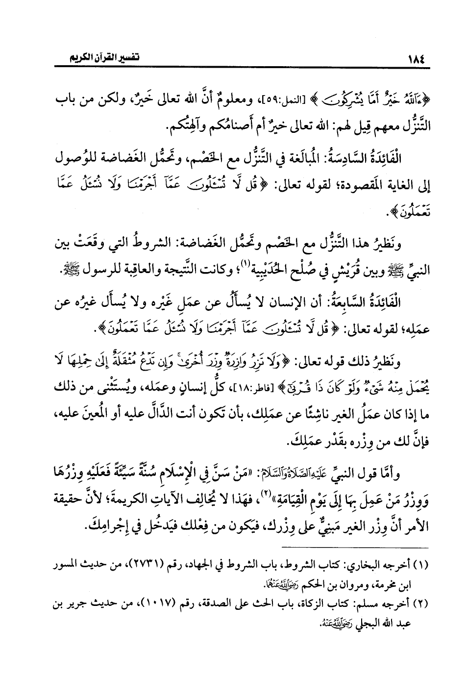 ونَظيرُ ذلك قوله تعالى: {وَلَا تَزِرُ وَازِرَةٌ وِزْرَ أُخْرَى وَإِنْ تَدْعُ مُثْقَلَةٌ إِلَى حِمْلِهَا لَا يُحْمَلْ مِنْهُ شَيْءٌ وَلَوْ كَانَ ذَا قُرْبَى} [فاطر: ١٨]، كلُّ إنسانٍ وعمَله، ويُستَثْنى من ذلك ما إذا كان عمَلُ الغير ناشِئًا عن عمَلِك، بأن تكون أنت الدَّالَّ عليه أو المُعينَ عليه، فإن لك من وِزْره بقَدْر عمَلِكَ.