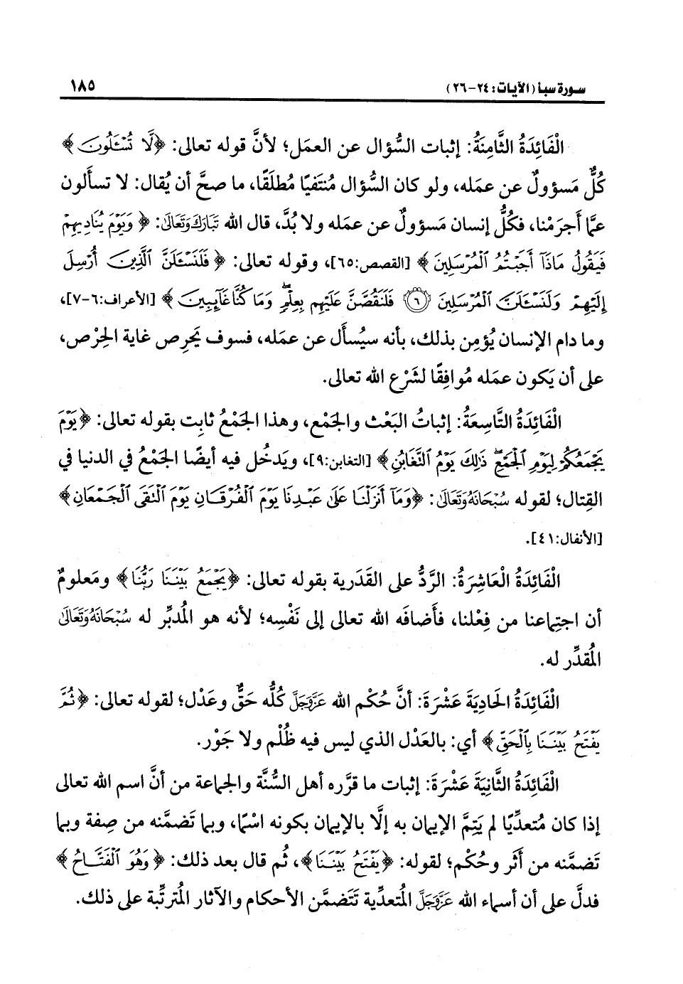 الْفَائِدَةُ الثَّامِنَةُ: إثبات السُّؤال عن العمَل؛ لأنَّ قوله تعالى، {لَا تُسْأَلُونَ} كُلٌّ مَسؤولٌ عن عمَله، ولو كان السُّؤال مُنتَفيًا مُطلَقًا، ما صحَّ أن يُقال: لا تسألون عمَّا أَجرَمْنا، فكُلُّ إنسانٌ مَسؤولٌ عن عمَله ولا بُدَّ، قال الله -تَبَارَكَ وَتَعَالَى-: {وَيَوْمَ يُنَادِيهِمْ فَيَقُولُ مَاذَا أَجَبْتُمُ الْمُرْسَلِينَ} [القصص: ٦٥]، وقوله تعالى: {فَلَنَسْأَلَنَّ الَّذِينَ أُرْسِلَ إِلَيْهِمْ وَلَنَسْأَلَنَّ الْمُرْسَلِينَ (٦) فَلَنَقُصَّنَّ عَلَيْهِمْ بِعِلْمٍ وَمَا كُنَّا غَائِبِينَ} [الأعراف: ٦ - ٧]، وما دام الإنسان يُؤمِن بذلك، بأنه سيُسأل عن عمَله، فسوف يَحرِص غاية الحِرْص، على أن يَكون عمَله مُوافِقاً لشَرْع الله تعالى.