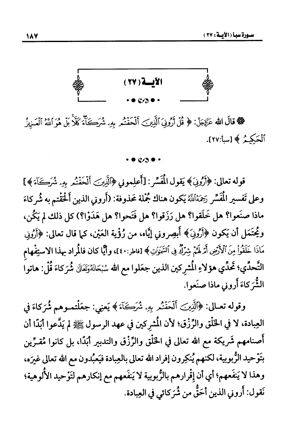 قوله تعالى: {أَرُونِيَ} يَقول المُفَسِّر: [أعلِموني {الَّذِينَ أَلْحَقْتُمْ بِهِ شُرَكَاءَ}] وعلى تَفسير المُفَسِّر -رَحِمَهُ اللهُ- يَكون هناك جُمْلة مَحذوفة: (أَروني الذين أَلحَقتم به شُركاءَ ماذا صنَعوا؟ هل خَلَقوا؟ هل رَزَقوا؟ هل فتَحوا؟ هل هَدَوْا؟ ) كل ذلك لم يَكُن، ويُحتَمَل أن يَكون {أَرُونِيَ} أَبصِروني إيَّاه، من رُؤْية العَيْن، كما قال تعالى: {أَرُونِي مَاذَا خَلَقُوا مِنَ الْأَرْضِ أَمْ لَهُمْ شِرْكٌ فِي السَّمَاوَاتِ} [فاطر: ٤٠]، وأيا كان فالُمراد بهذا الاستِفهامِ التَحدي؛ تَحدِّي هؤلاء المُشرِكين الذين جعَلوا مع الله -سُبْحَانَهُ وَتَعَالَى- شُرَكاءَ قُلْ: هاتوا الشُّرَكاءَ أروني ماذا صنَعوا.