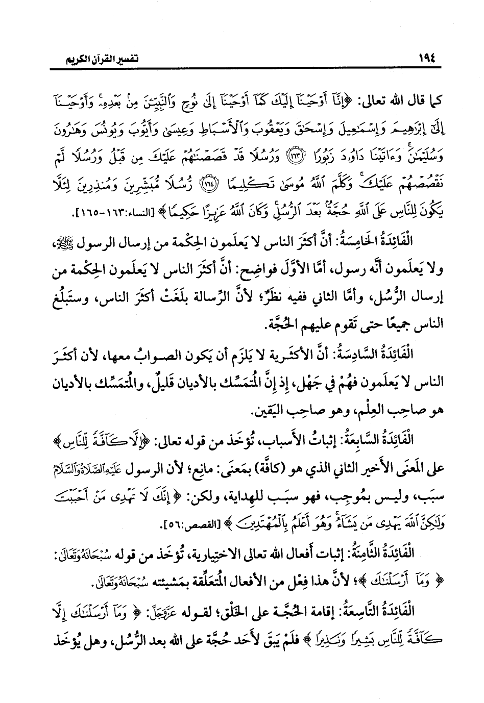الْفَائِدَةُ التَّاسِعَةُ: إقامة الحجَّة على الخلْق؛ لقوله -عَزَّ وَجَلَّ-: {وَمَا أَرْسَلْنَاكَ إِلَّا كَافَّةً لِلنَّاسِ بَشِيرًا وَنَذِيرًا} فلَمْ يَبقَ لأَحَد حُجَّة على الله بعد الرُّسُل، وهل يُؤخَذ