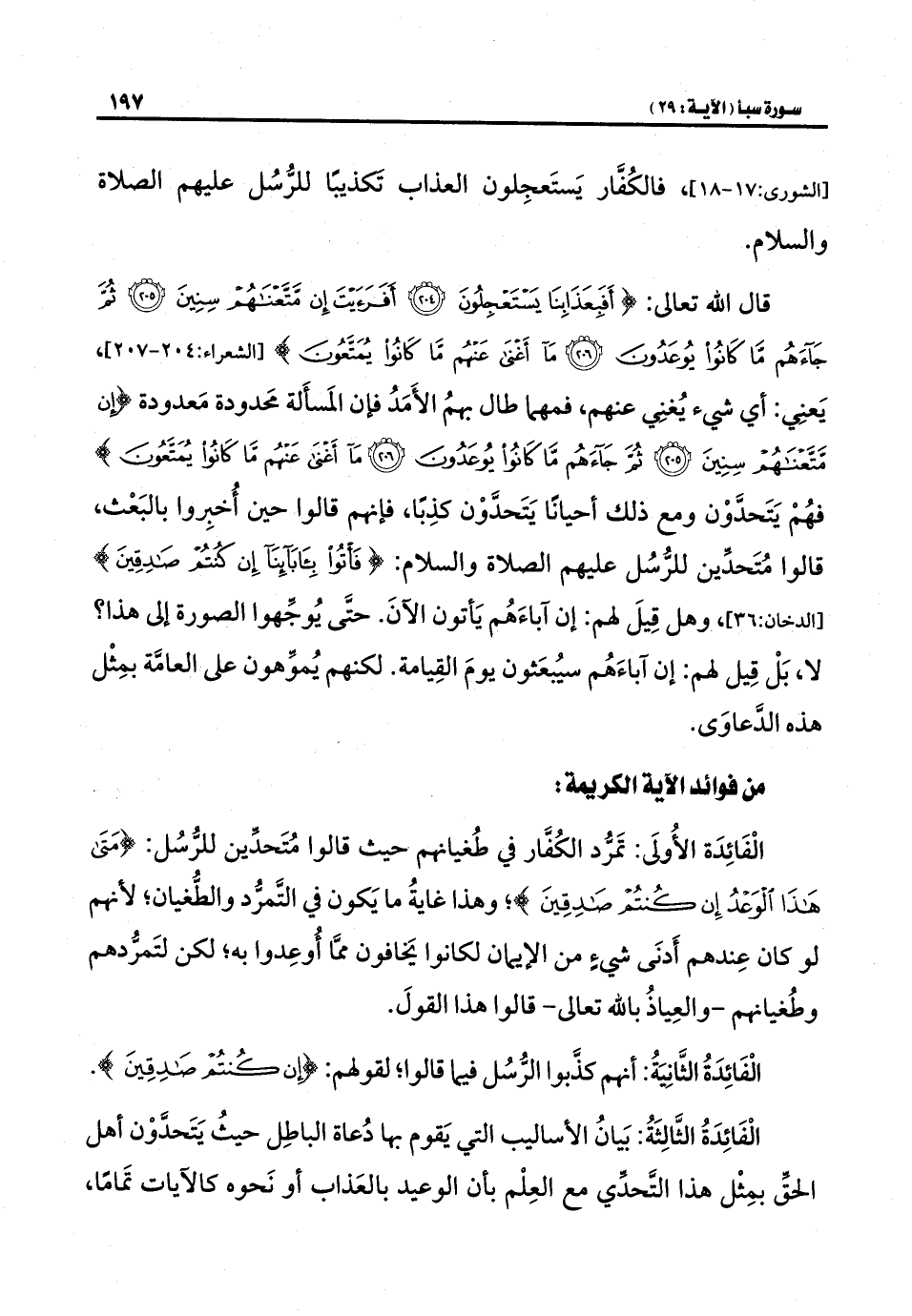 الْفَائِدَةُ الأُولَى: تمَرُّد الكُفَّار في طُغيانهم حيث قالوا مُتَحدِّين للرُّسُل: {مَتَى هَذَا الْوَعْدُ إِنْ كُنْتُمْ صَادِقِينَ}؛ وهذا غايةُ ما يَكون في التَّمرُّد والطُّغيان؛ لأنهم لو كان عِندهم أَدنَى شيءٍ من الإيمان لكانوا يَخافون ممَّا أُوعِدوا به؛ لكن لتَمرُّدهم وطُغيانهم -والعِياذُ بالله تعالى- قالوا هذا القولَ.