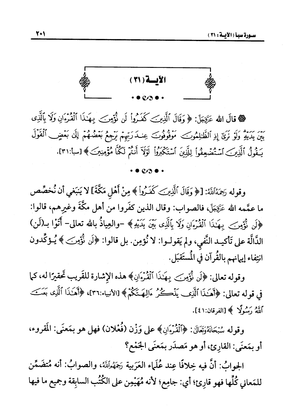 وقوله -رَحِمَهُ اللهُ-: {وَقَالَ الَّذِينَ كَفَرُوا} مِنْ أَهْلِ مَكَّةَ] لا يَنبَغي أن نُخصِّص ما عمَّمه الله -عَزَّ وَجَلَّ-، فالصواب: وقال الذين كفَروا من أهل مكَّةَ وغيرهم، قالوا: {لَنْ نُؤْمِنَ بِهَذَا الْقُرْآنِ وَلَا بِالَّذِي بَيْنَ يَدَيْهِ} - والعِياذُ بالله تعالى- أَتَوْا بـ (لَن) الدَّالَّة على تَأكيد النَّفيِ، ولم يَقولوا: لا نُؤمِن. بل قالوا: {لَنْ نُؤْمِنَ} يُؤكِّدون انتِفاء إيمانهم بالقُرآن في المُستَقبَل.