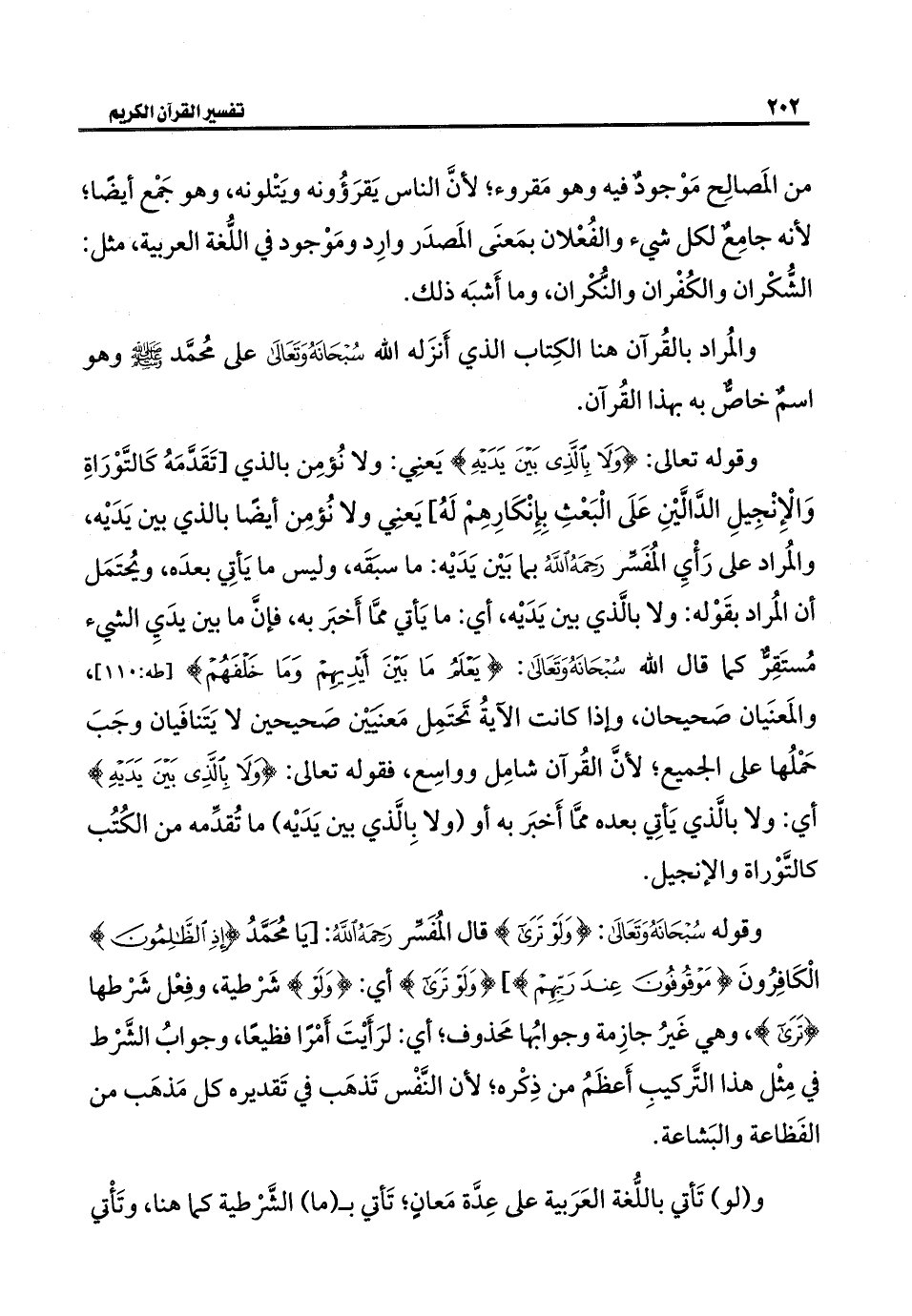 وقوله تعالى: {وَلَا بِالَّذِي بَيْنَ يَدَيْهِ} يَعنِي: ولا نُؤمِن بالذي [تَقَدَّمَهُ كَالتَّوْرَاةِ وَالْإِنْجِيلِ الدَّالَّيْنِ عَلَى الْبَعْثِ بِإِنْكَارِهِمْ لَهُ] يَعنِي ولا نُؤمِن أيضًا بالذي بين يَدَيْه، والمُراد على رَأْيِ المُفَسِّر رَحِمَهُ اللهُ بما بَيْن يَدَيْه: ما سبَقَه، وليس ما يَأتِي بعدَه، ويُحتَمَل أن المُراد بقَوْله: ولا بالَّذي بين يَدَيْه، أي: ما يَأتي ممَّا أَخبَر به، فإنَّ ما بين يدَيِ الشيء مُستَقِرٌّ كما قال الله سُبْحَانَهُ وَتَعَالَى: {يَعْلَمُ مَا بَيْنَ أَيْدِيهِمْ وَمَا خَلْفَهُمْ} [طه: ١١٠]، والمَعنَيان صَحيحان، وإذا كانت الآيةُ تَحتَمِل مَعنيَيْن صَحيحين لا يَتَنافَيان وجَبَ حَمْلُها على الجميع؛ لأنَّ القُرآن شامِل وواسِع، فقوله تعالى: {وَلَا بِالَّذِي بَيْنَ يَدَيْهِ} أي: ولا بالَّذي يَأتِي بعده ممَّا أَخبَر به أو (ولا بِالَّذي بين يَدَيْه) ما تُقدِّمه من الكُتُب كالتَّوْراة والإنجيل.