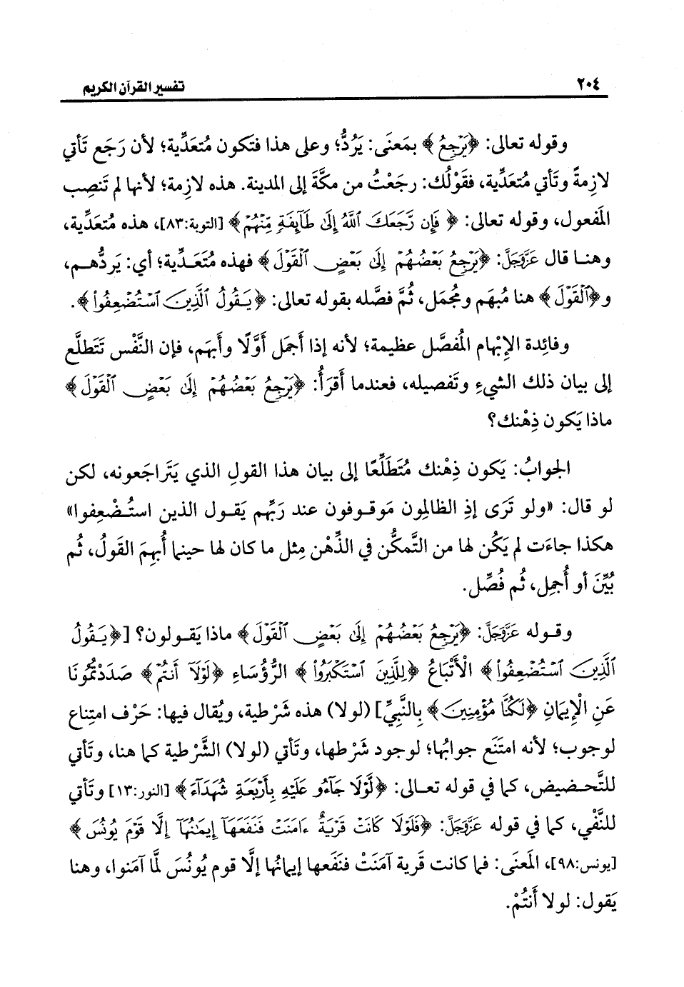 وقوله عَزَّ وَجَلَّ: {يَرْجِعُ بَعْضُهُمْ إِلَى بَعْضٍ الْقَوْلَ} ماذا يَقولون؟ [{يَقُولُ الَّذِينَ اسْتُضْعِفُوا} الْأَتْبَاعُ {لِلَّذِينَ اسْتَكْبَرُوا} الرُّؤُسَاءِ {لَوْلَا أَنْتُمْ} صَدَدْتُمُونَا عَنِ الْإِيمَانِ {لَكُنَّا مُؤْمِنِينَ} بِالنَّبِيِّ] (لولا) هذه شَرْطية، ويُقال فيها: حَرْف امتِناع لوجوب؛ لأنه امتَنَع جوابُها؛ لوجود شَرْطها، وتَأتي (لولا) الشَّرْطية كما هنا، وتَأتي للتَّحضيض، كما في قوله تعالى: {لَوْلَا جَاءُوا عَلَيْهِ بِأَرْبَعَةِ شُهَدَاءَ} [النور: ١٣] وتَأتي للنَّفْي، كما في قوله عَزَّ وَجَلَّ: {فَلَوْلَا كَانَتْ قَرْيَةٌ آمَنَتْ فَنَفَعَهَا إِيمَانُهَا إِلَّا قَوْمَ يُونُسَ} [يونس: ٩٨]، المَعنَى: فما كانت قَرية آمَنَتْ فنَفَعها إيمانُها إلَّا قوم يُونُسَ لمَّا آمَنوا، وهنا يَقول: لولا أَنتُمْ.